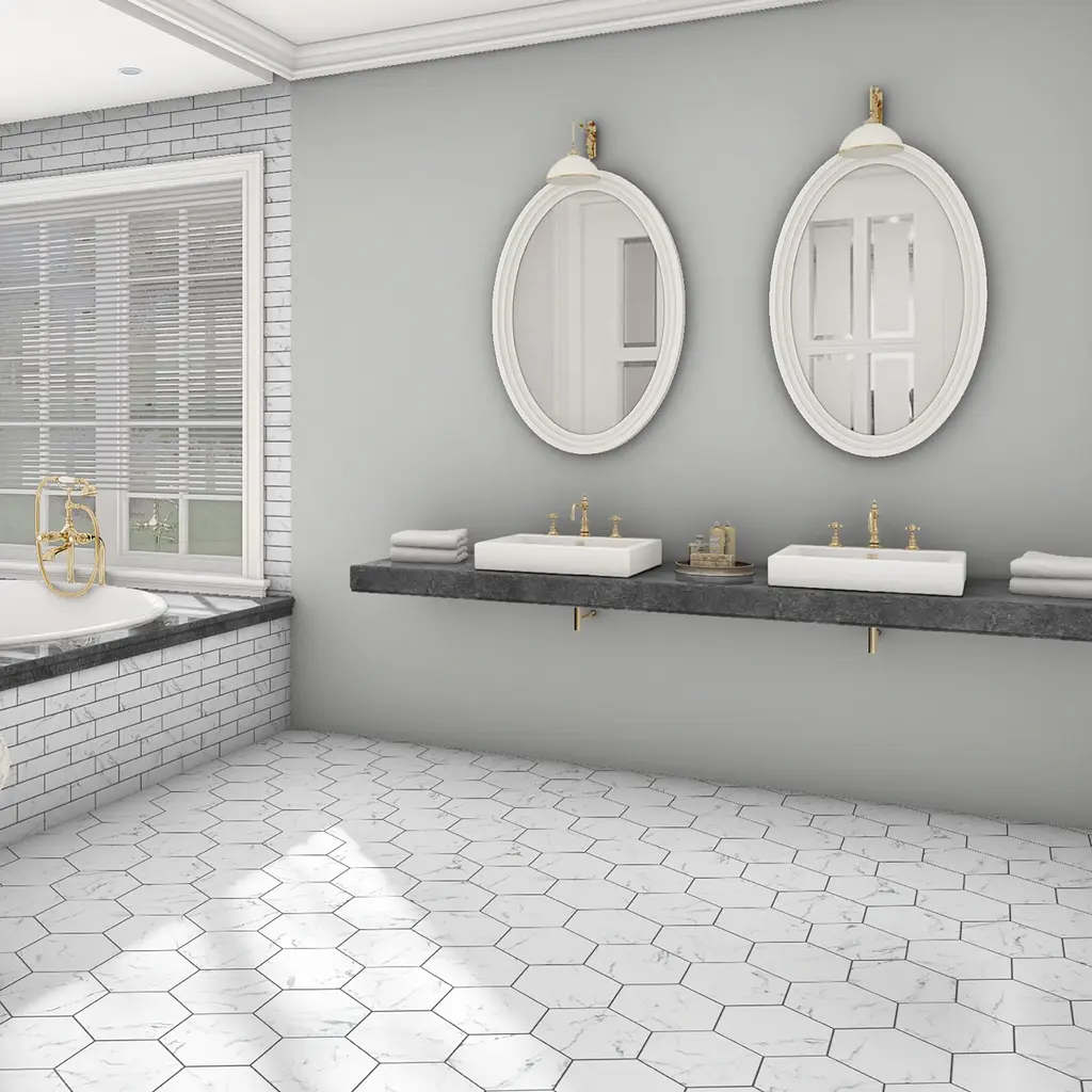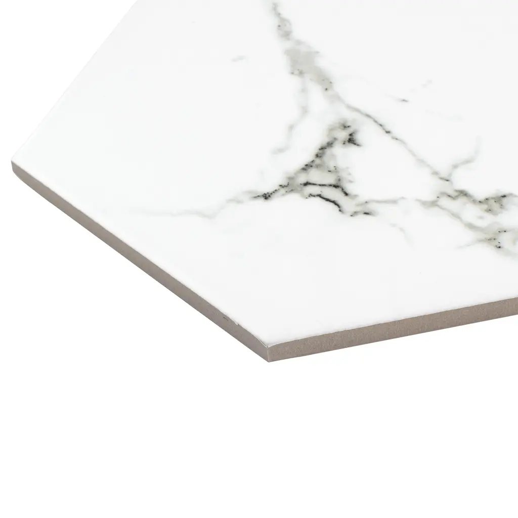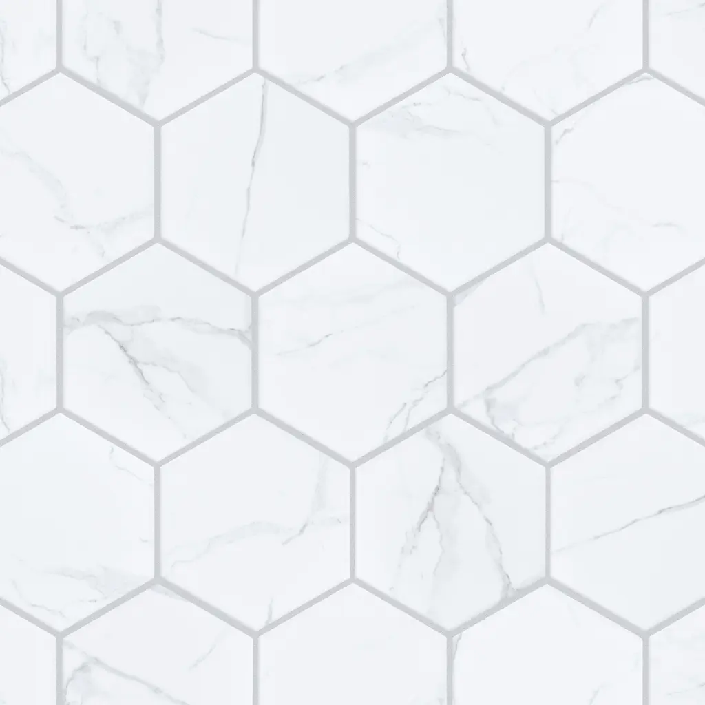 Capturing the appearance of a marble look, our Timeless Calacatta Hex Porcelain Floor and Wall Tile features a smooth, matte finish, providing decorative appeal that adapts to a variety of stylistic contexts. Containing 47 different print variations that are randomly distributed throughout each case, this white hexagon tile offers a one-of-a-kind look. With its impervious, frost-resistant features, this tile is an ideal selection for a variety of spaces including indoor and outdoor commercial and residential installations, kitchens, bathrooms, backsplashes, showers, hallways, entryways, patios, pools and fireplace facades. This tile is a perfect choice on its own or with other products in the Merola Tile, Timeless Collection. To ensure optimal results, please consult with your installer and review the product specifications to confirm that this tile meets the specific needs of your project.