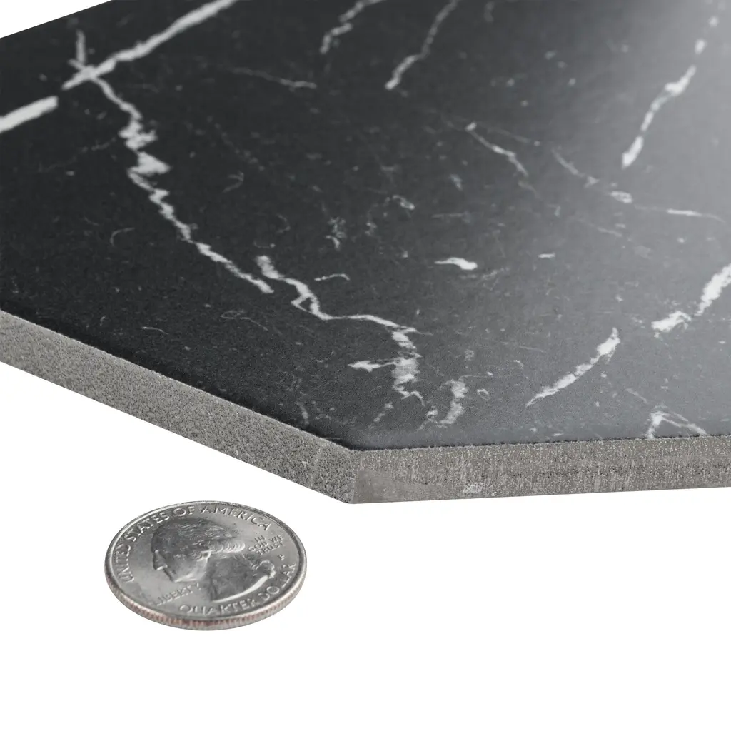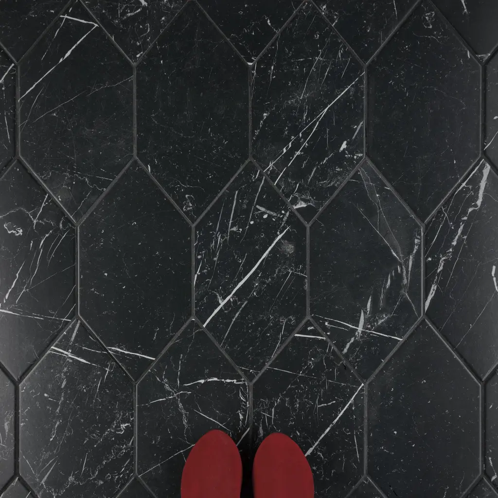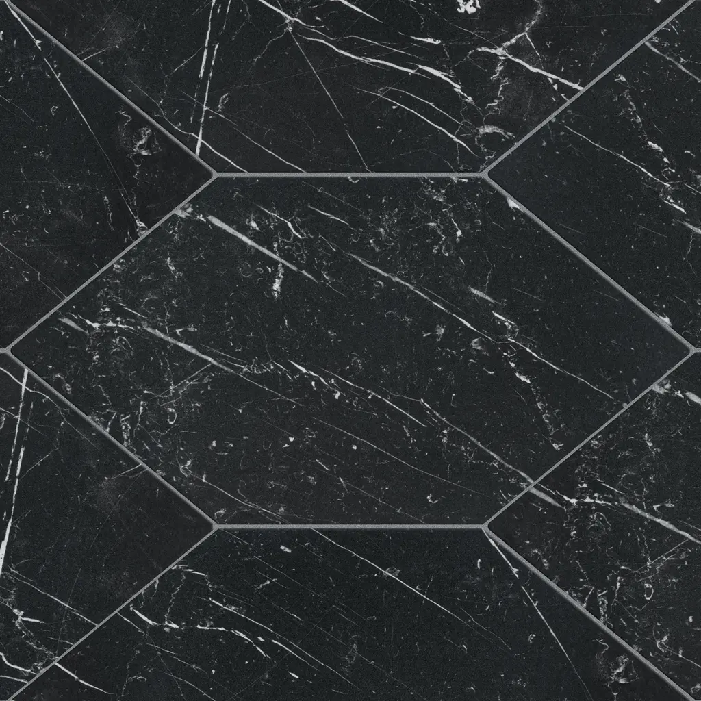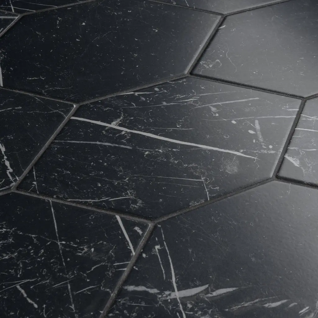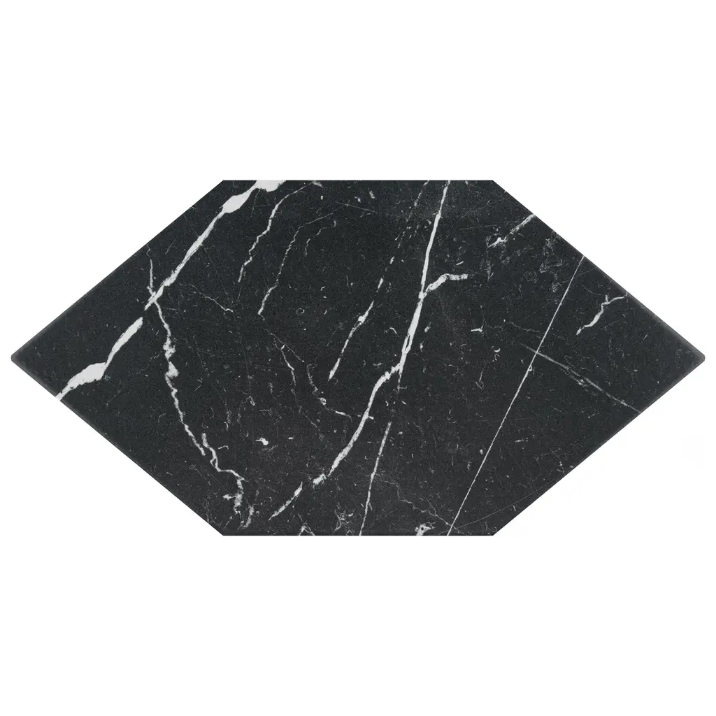 Emulating the timeless beauty of marble in a reimagined geometric format, Marquina Kayak Black Porcelain Floor and Wall Tile provides playful visual appeal in any space. This marble-look tile offers a fresh approach to the classic hexagon silhouette with its unique elongated shape. Set on a smooth, matte black base glaze, this tile is complemented with white veining striations that sporadically flow throughout the design for added authenticity. This trendsetting display of sophisticated geometric design is visually appealing and versatile, and blends beautifully with a range of styles from traditional to modern day. Available in 23 different print variations that are randomly distributed throughout each case, this tile offers a one-of-a-kind look. Its impervious and frost-resistant features make it an ideal choice for indoor and outdoor installations including kitchens, bathrooms, backsplashes, showers, entryways and patios. Tile is the better choice for your space. This tile is made from natural ingredients, making it a healthy choice as it is free from allergens, VOCs, formaldehyde and PVC. 8.4 square feet, 20 pieces per case. Case weight is 39 lbs. Grade 1, first-quality porcelain tile for floor and wall use 6.5 in. width x 12.5 in. length x 0.37 in. thick Glazed, smooth finish with a low sheen and substantial variation in tone PEI Rating III is suitable for medium-duty residential floors including kitchens, halls, corridors, balconies, terraces and areas used more often with normal footwear and small amounts of dirt Impervious tiles have a water absorption of less than 0.5% for indoor and outdoor use and are frost resistant This tile is ADA approved for slip resistance with a DCOF value of 0.42 or higher. Completely frost resistant for indoor or outdoor applications; use a latex-modified thinset for acceptable bond strength Please note: Samples are not returnable