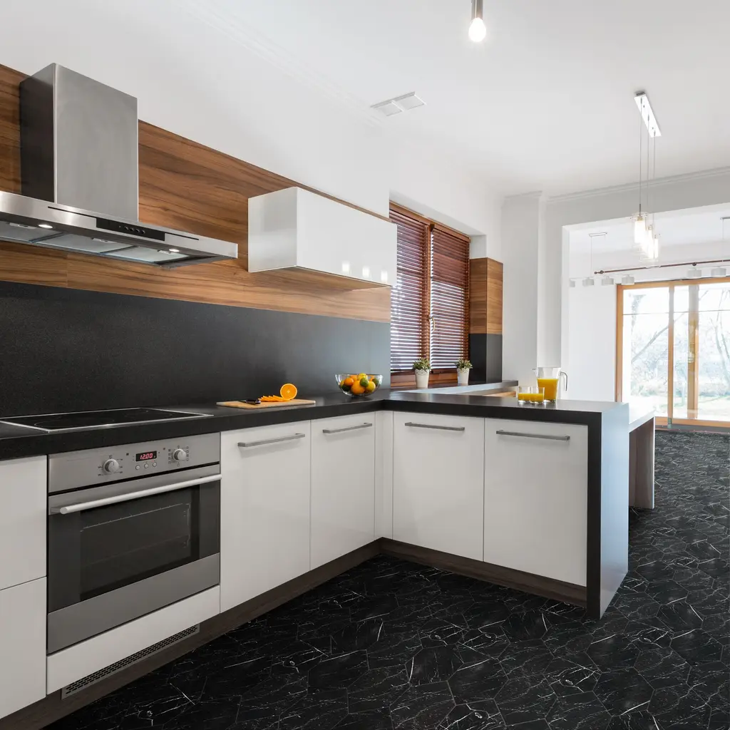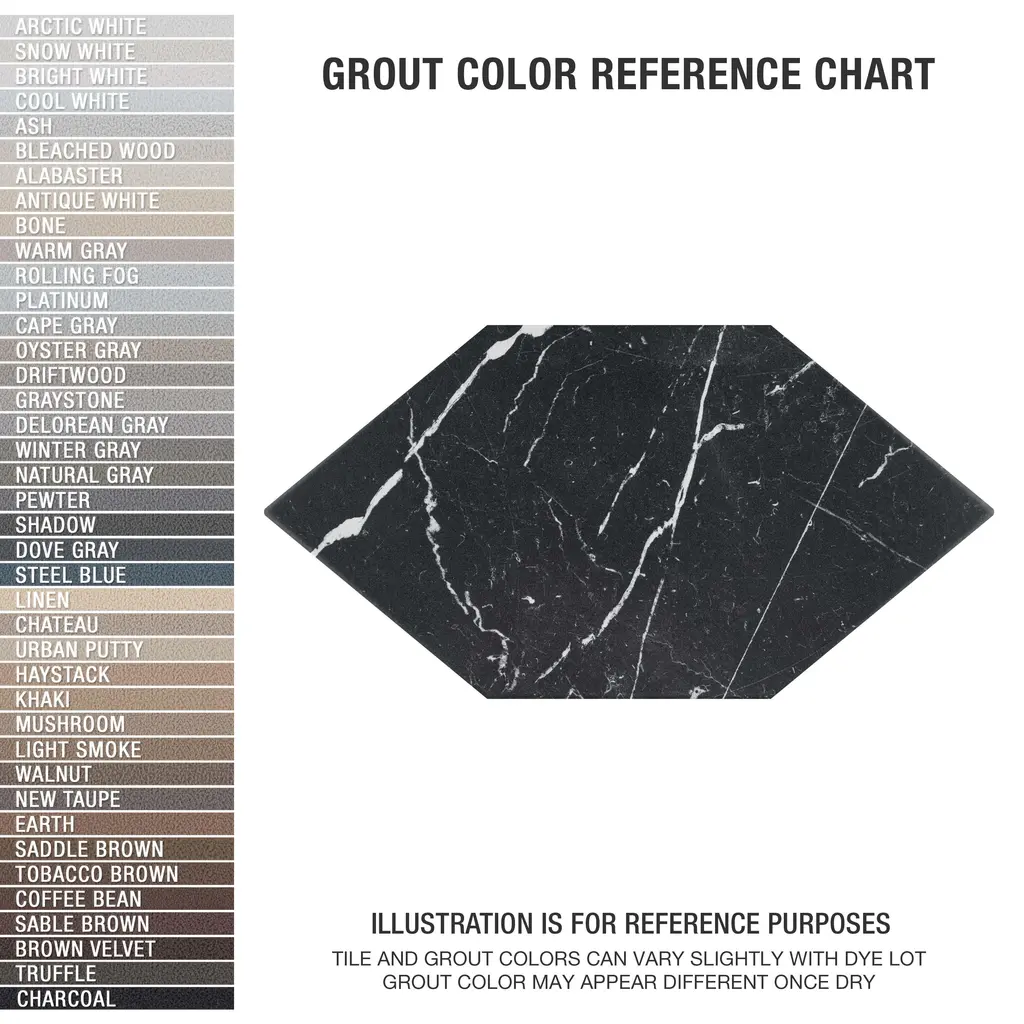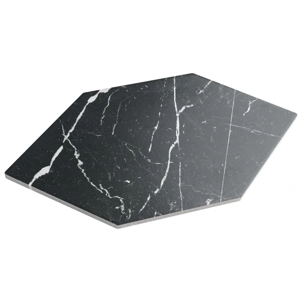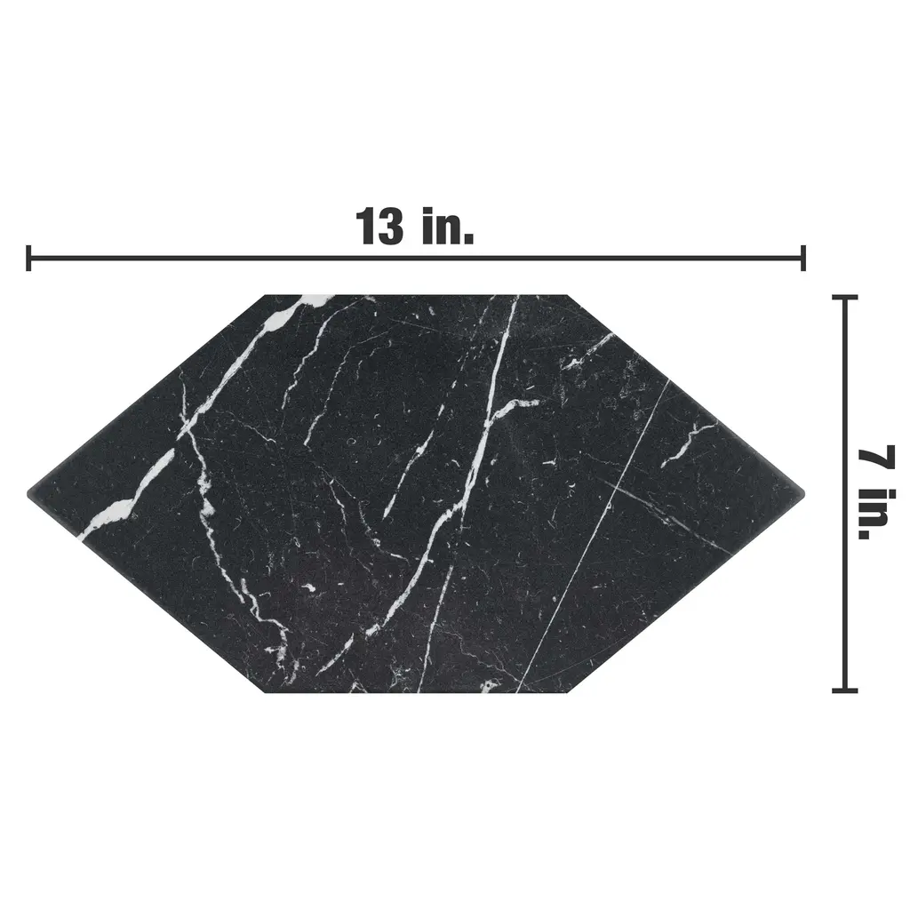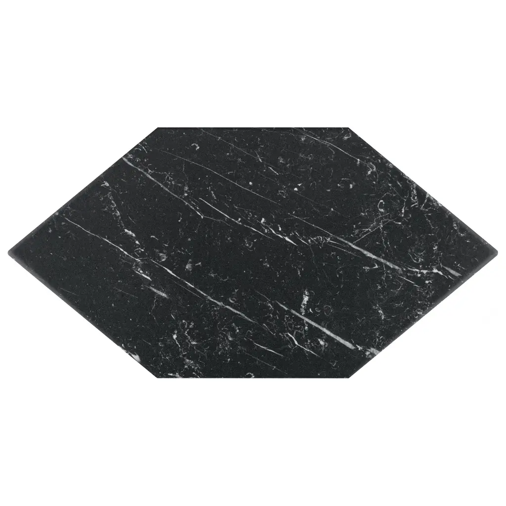 Emulating the timeless beauty of marble in a reimagined geometric format, Marquina Kayak Black Porcelain Floor and Wall Tile provides playful visual appeal in any space. This marble-look tile offers a fresh approach to the classic hexagon silhouette with its unique elongated shape. Set on a smooth, matte black base glaze, this tile is complemented with white veining striations that sporadically flow throughout the design for added authenticity. This trendsetting display of sophisticated geometric design is visually appealing and versatile, and blends beautifully with a range of styles from traditional to modern day. Available in 23 different print variations that are randomly distributed throughout each case, this tile offers a one-of-a-kind look. Its impervious and frost-resistant features make it an ideal choice for indoor and outdoor installations including kitchens, bathrooms, backsplashes, showers, entryways and patios. Tile is the better choice for your space. This tile is made from natural ingredients, making it a healthy choice as it is free from allergens, VOCs, formaldehyde and PVC. 8.4 square feet, 20 pieces per case. Case weight is 39 lbs. Grade 1, first-quality porcelain tile for floor and wall use 6.5 in. width x 12.5 in. length x 0.37 in. thick Glazed, smooth finish with a low sheen and substantial variation in tone PEI Rating III is suitable for medium-duty residential floors including kitchens, halls, corridors, balconies, terraces and areas used more often with normal footwear and small amounts of dirt Impervious tiles have a water absorption of less than 0.5% for indoor and outdoor use and are frost resistant This tile is ADA approved for slip resistance with a DCOF value of 0.42 or higher. Completely frost resistant for indoor or outdoor applications; use a latex-modified thinset for acceptable bond strength Please note: Samples are not returnable