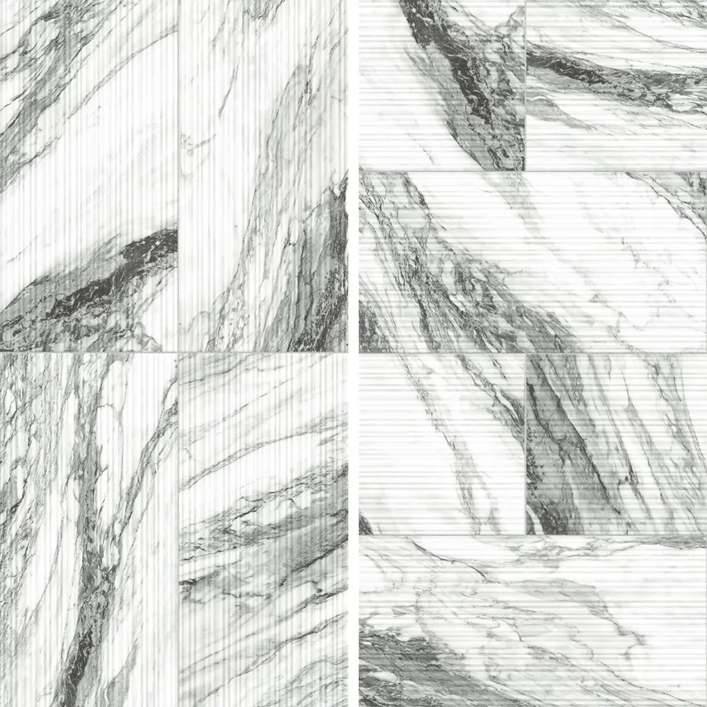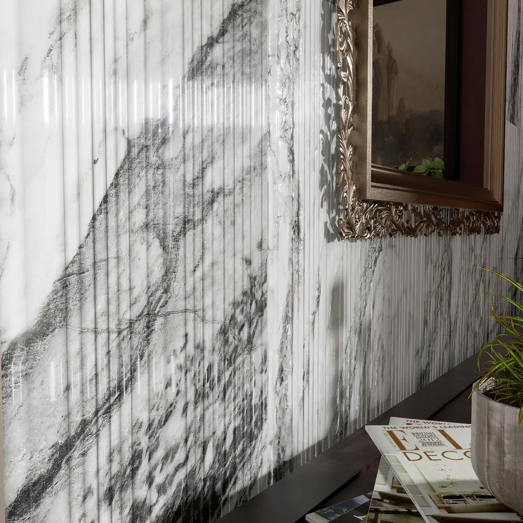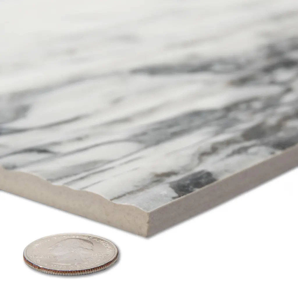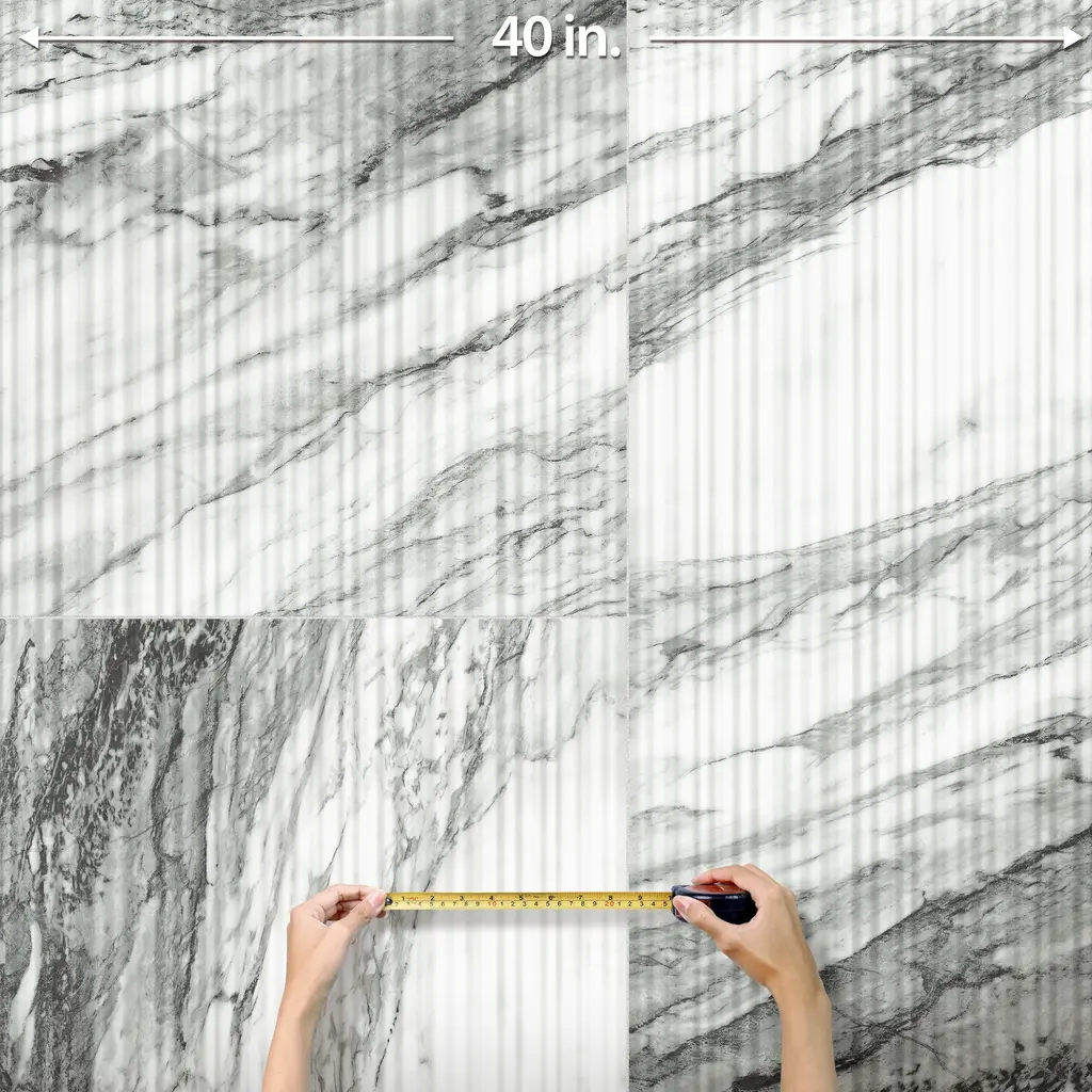 Offering a fluted look, our Touche Pleated Deco Zebre Porcelain Floor and Wall Tile features a slightly textured, satin finish, providing decorative appeal that adapts to a variety of stylistic contexts. Inspired by high-end luxury marble, the Touche Collection captures porcelain's durability and realistic undulation, offering a bold, dramatic aesthetic with rectified edges, creating a timeless, sophisticated ambiance for serene, opulent experiences in any setting. Containing 16 different print variations that are randomly distributed throughout each case, this black rectangle tile offers a one-of-a-kind look. With its impervious, frost-resistant features, this tile is an ideal selection for a variety of spaces including indoor and outdoor commercial and residential installations, kitchens, bathrooms, backsplashes, showers, hallways, entryways, patios and fireplace facades. This tile is a perfect choice on its own or with other products in the Merola Tile, Touche Collection. To ensure optimal results, please consult with your installer and review the product specifications to confirm that this tile meets the specific needs of your project.