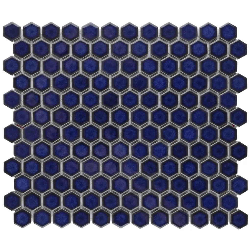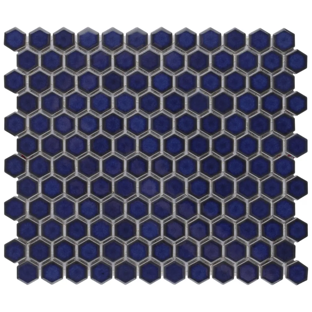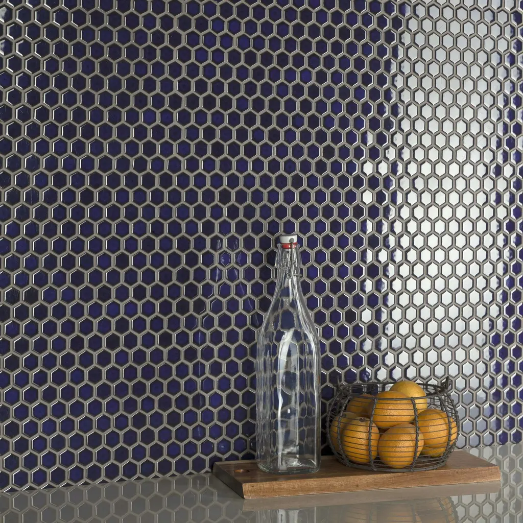 Our Tribeca 1" Hex Glossy Cobalt Porcelain Floor and Wall Mosaic Tile instantly elevates spaces through a refreshing dose of geometric design. With subtle variations in color tone that gradually fade to black around the border, each piece is truly unique. Its rich reactive glaze echoes dark to deep midnight blue hues with a high-gloss finish that is unique yet simplistic enough to integrate into any design, ranging from traditional style renovations to modern home projects. Its impervious and frost-resistant features make this an ideal tile for both indoor and outdoor residential use, including backsplashes, bathrooms, showers and kitchens. Tile is the better choice for your space. This tile is made from natural ingredients, making it a healthy choice as it is free from allergens, VOCs, formaldehyde and PVC. 8.6 square feet, 10 pieces per case. Case weight is 17.81 lbs. Grade 1, first-quality porcelain tile for floor and wall use 10.25 in. width x 11.88 in. length x 0.23 in. thick mesh-mounted mosaic Glazed, smooth finish with a high sheen and slight variation in tone PEI Rating II is suitable for all interior walls and light foot traffic such as powder rooms Impervious tiles have a water absorption of less than 0.5% for indoor and outdoor use and are frost resistant This tile has a COF wet rating less than or equal to 0.50 and is considered to have a marginally low skid resistance. This tile is not ADA approved for slip resistance. Completely frost resistant for indoor or outdoor applications; use a latex-modified thinset for acceptable bond strength Please note: A sample of this product may be a partial piece cut from the full size tile in order to provide an affordable and convenient way for customers to judge the quality and finish of this item. Samples are not returnable.