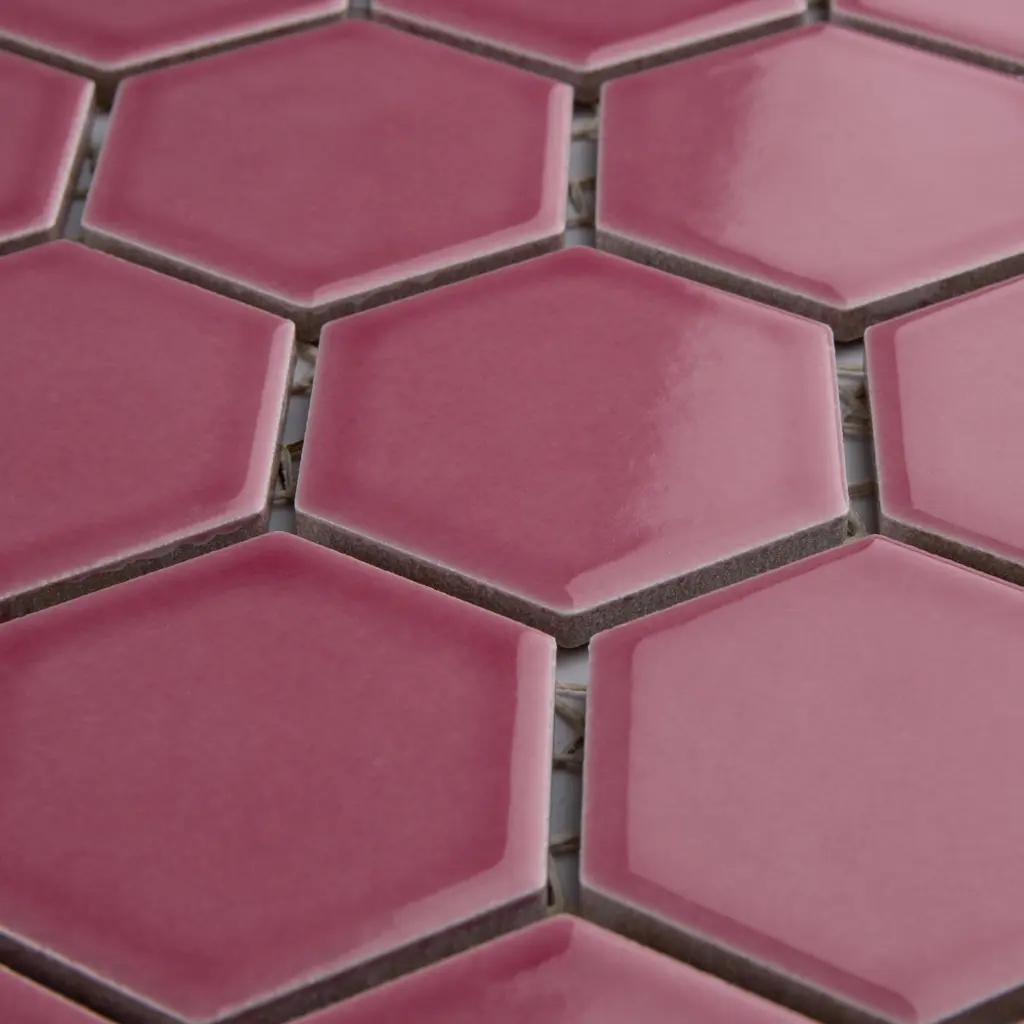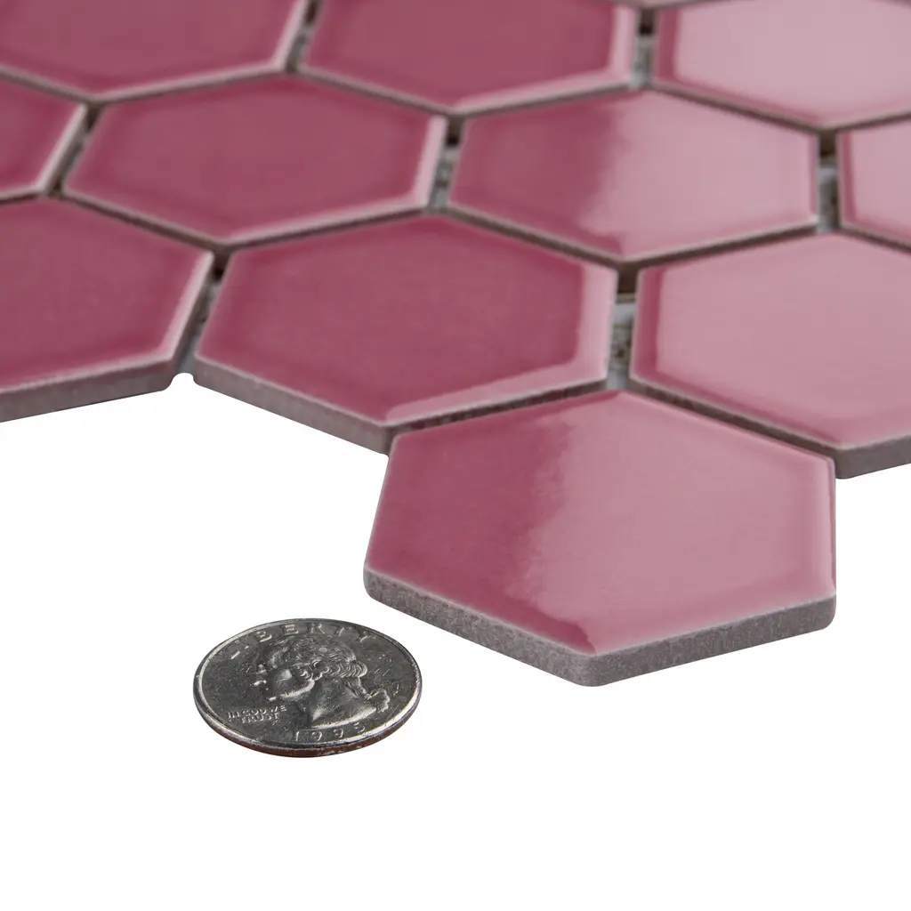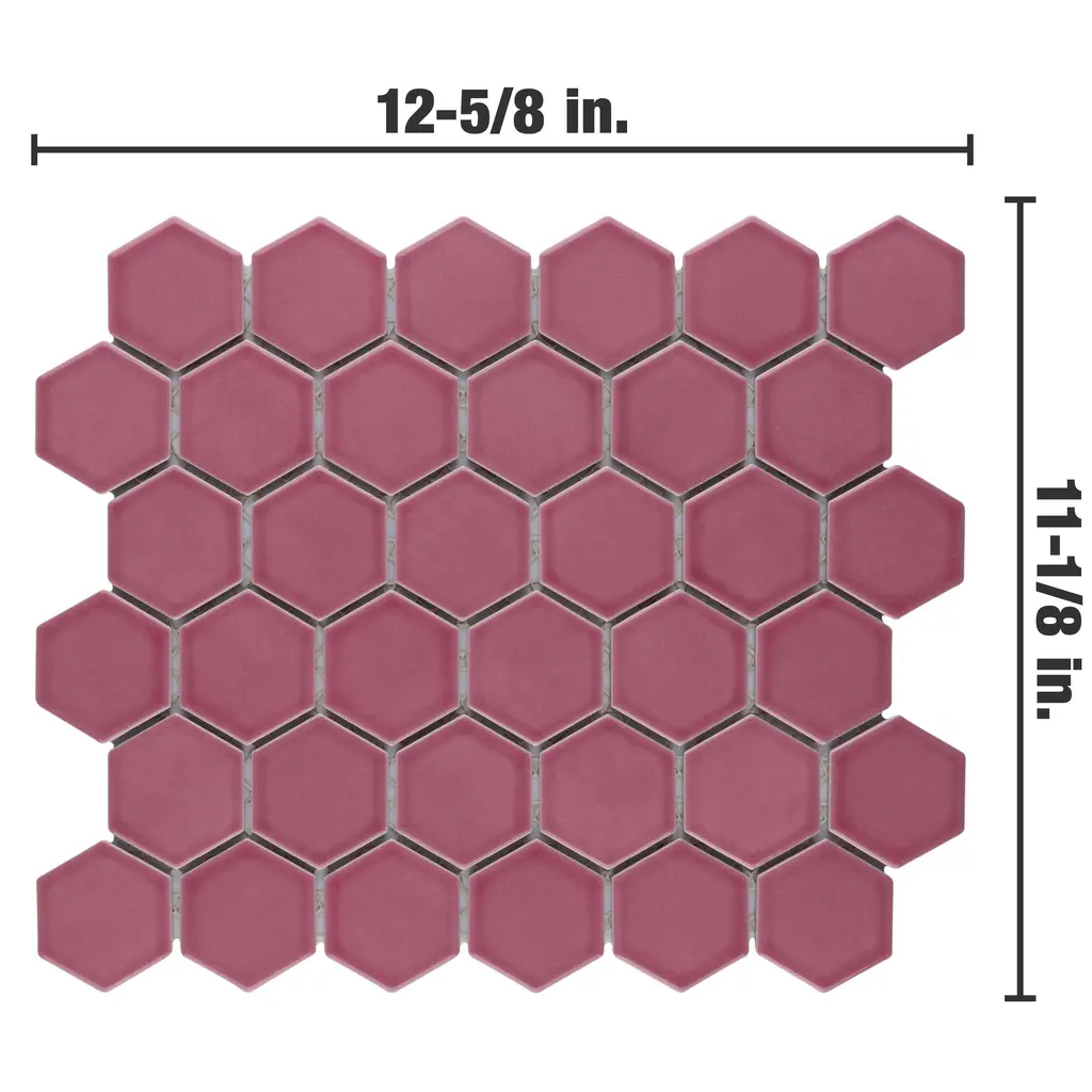Offering a mosaic look, our Tribeca 2 in. Hex Glossy Blush Porcelain Floor and Wall Tile features a smooth, glossy finish, providing decorative appeal that adapts to a variety of stylistic contexts. With its impervious, frost-resistant features, this pink hexagon mosaic is an ideal selection for both indoor and outdoor residential installations, including kitchens, bathrooms, backsplashes, showers, hallways and fireplace facades. This tile is a perfect choice on its own or paired with other products in the Tribeca Collection. Tile is the better choice for your space! 10.0 square feet, 10 pieces per case. Case weight is 25.33 lbs. Grade 1, first-quality porcelain tile for floor and wall use 11.13 in. width x 12.63 in. length x 0.27 in. thick mesh-mounted mosaic Glazed, smooth finish with a high sheen and uniform appearance in tone PEI Rating III is suitable for medium-duty residential floors including kitchens, halls, corridors, balconies, terraces and areas used more often with normal footwear and small amounts of dirt Impervious tiles have a water absorption of less than 0.5% for indoor and outdoor use and are frost resistant This tile has a COF wet rating less than or equal to 0.50 and is considered to have a marginally low skid resistance. This tile is not ADA approved for slip resistance. Completely frost resistant for indoor or outdoor applications; use a latex-modified thinset for acceptable bond strength Please note: A sample of this product may be a partial piece cut from the full size tile in order to provide an affordable and convenient way for customers to judge the quality and finish of this item. Samples are not returnable.