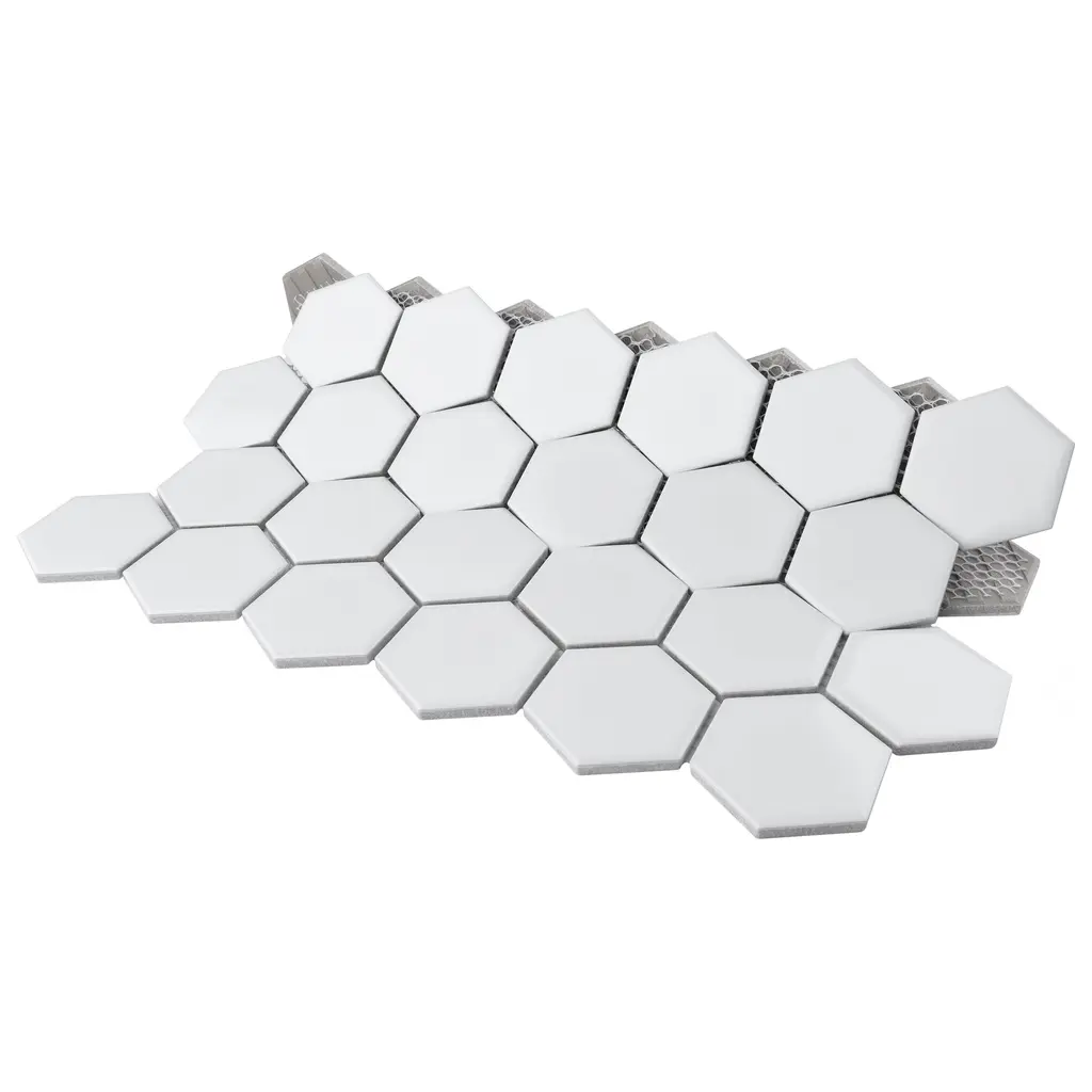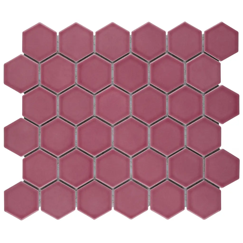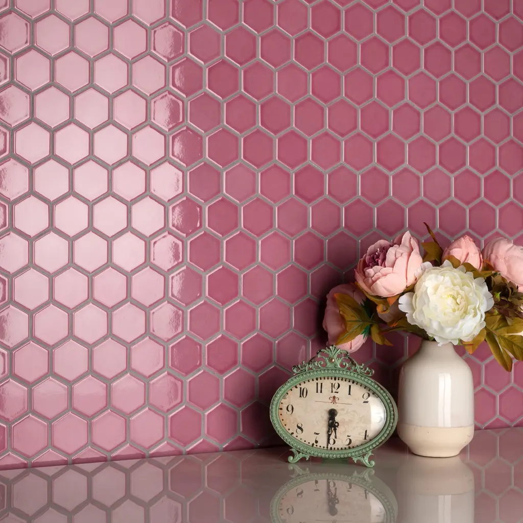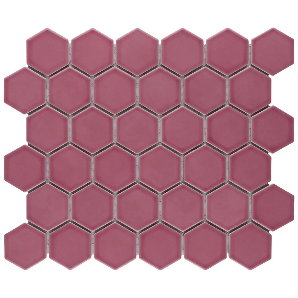 Offering a mosaic look, our Tribeca 2 in. Hex Glossy Blush Porcelain Floor and Wall Tile features a smooth, glossy finish, providing decorative appeal that adapts to a variety of stylistic contexts. With its impervious, frost-resistant features, this pink hexagon mosaic is an ideal selection for both indoor and outdoor residential installations, including kitchens, bathrooms, backsplashes, showers, hallways and fireplace facades. This tile is a perfect choice on its own or paired with other products in the Tribeca Collection. Tile is the better choice for your space! 10.0 square feet, 10 pieces per case. Case weight is 25.33 lbs. Grade 1, first-quality porcelain tile for floor and wall use 11.13 in. width x 12.63 in. length x 0.27 in. thick mesh-mounted mosaic Glazed, smooth finish with a high sheen and uniform appearance in tone PEI Rating III is suitable for medium-duty residential floors including kitchens, halls, corridors, balconies, terraces and areas used more often with normal footwear and small amounts of dirt Impervious tiles have a water absorption of less than 0.5% for indoor and outdoor use and are frost resistant This tile has a COF wet rating less than or equal to 0.50 and is considered to have a marginally low skid resistance. This tile is not ADA approved for slip resistance. Completely frost resistant for indoor or outdoor applications; use a latex-modified thinset for acceptable bond strength Please note: A sample of this product may be a partial piece cut from the full size tile in order to provide an affordable and convenient way for customers to judge the quality and finish of this item. Samples are not returnable.