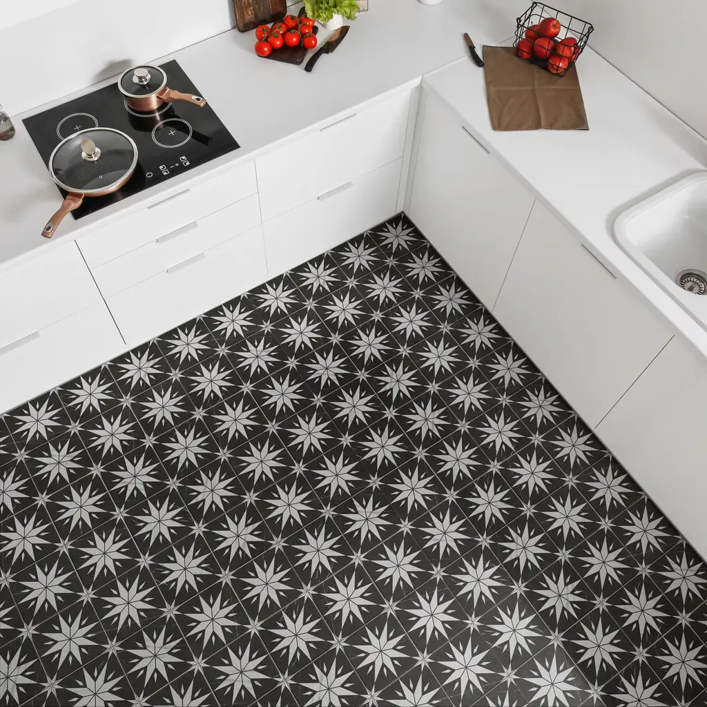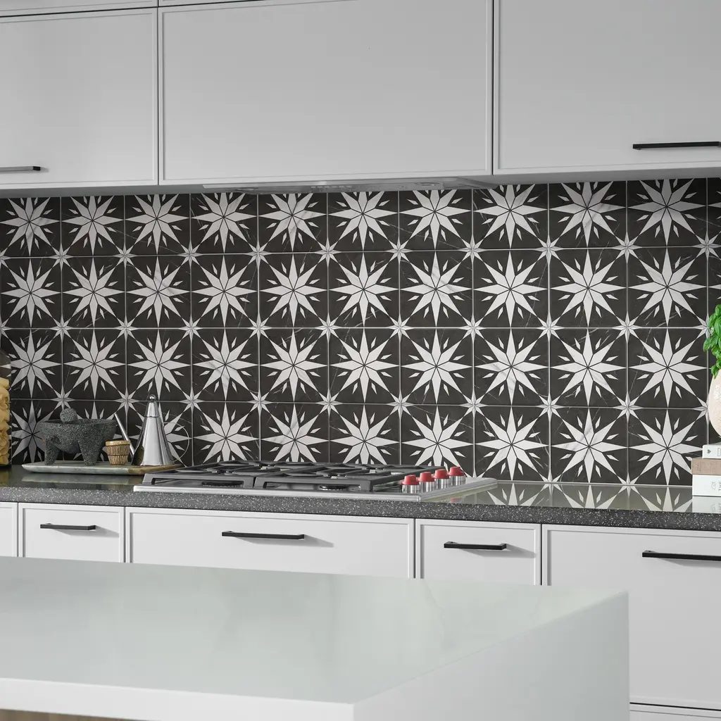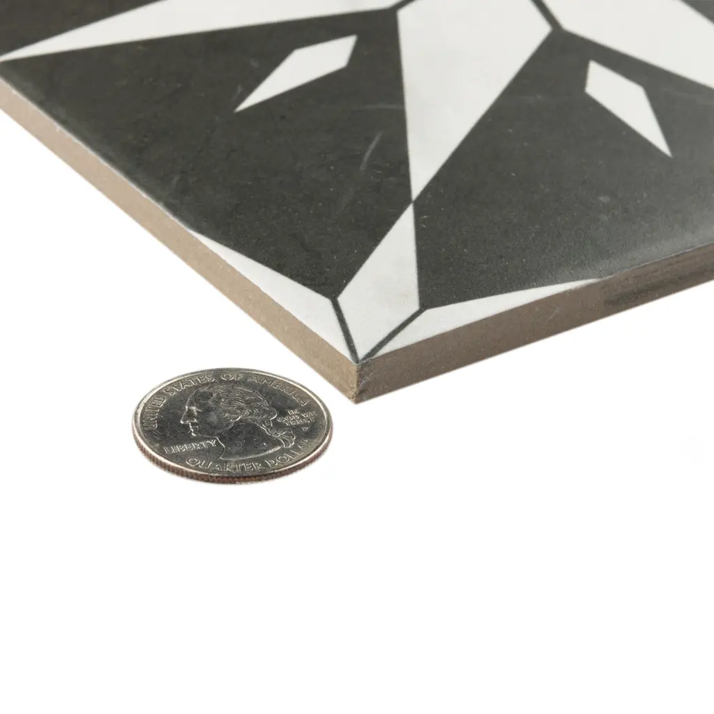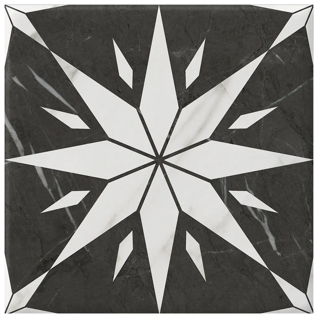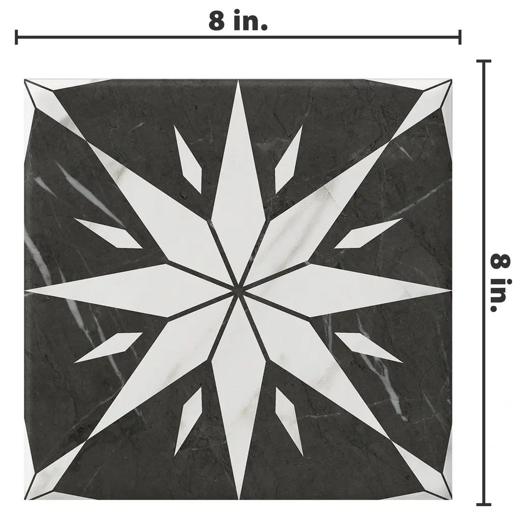Capturing the appearance of a marble look, our Ursino Star Carrara Porcelain Floor and Wall Tile features a slightly textured, matte finish, providing decorative appeal that adapts to a variety of stylistic contexts. Containing 18 different print variations that are randomly distributed throughout each case, this black square tile offers a one-of-a-kind look. With its impervious, frost-resistant features, this tile is an ideal selection for both indoor and outdoor residential installations, including bathrooms, backsplashes, showers, hallways and fireplace facades. This tile is a perfect choice on its own or paired with other products in the Ursino Collection. Tile is the better choice for your space! 6.75 square feet, 15 pieces per case. Case weight is 25.66 lbs. Grade 1, first-quality porcelain tile for floor and wall use 7.88 in. width x 7.88 in. length x 0.35 in. thick Glazed, slightly textured finish with a low sheen and slight variation in tone PEI Rating II is suitable for all interior walls and light foot traffic such as powder rooms Impervious tiles have a water absorption of less than 0.5% for indoor and outdoor use and are frost resistant This tile is ADA approved for slip resistance with a DCOF value of 0.42 or higher. Completely frost resistant for indoor or outdoor applications; use a latex-modified thinset for acceptable bond strength Please note: A sample of this product may be a partial piece cut from the full size tile in order to provide an affordable and convenient way for customers to judge the quality and finish of this item. Samples are not returnable.