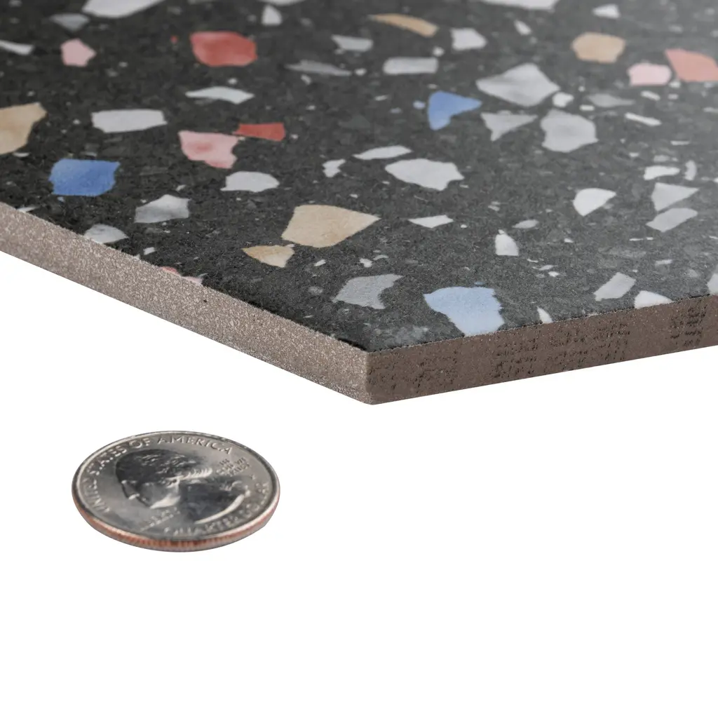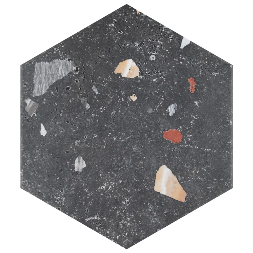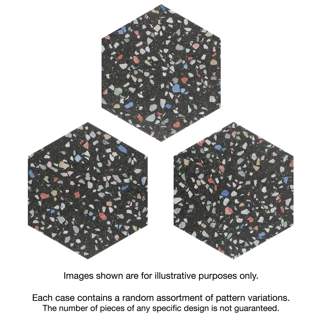 Replicating a terrazzo look, our Venice Hex Colors Dark Porcelain Floor and Wall Tile features a slightly textured, matte finish, providing decorative appeal that adapts to a variety of stylistic contexts. Containing 21 different print variations that are randomly distributed throughout each case, this black hexagon tile offers a one-of-a-kind look. With its impervious, frost-resistant features, this tile is an ideal selection for a variety of spaces including indoor and outdoor residential installations, kitchens, bathrooms, backsplashes, showers, hallways, pools and fireplace facades. This tile is a perfect choice on its own or with other products in the Merola Tile, Venice Collection. To ensure optimal results, please consult with your installer and review the product specifications to confirm that this tile meets the specific needs of your project.