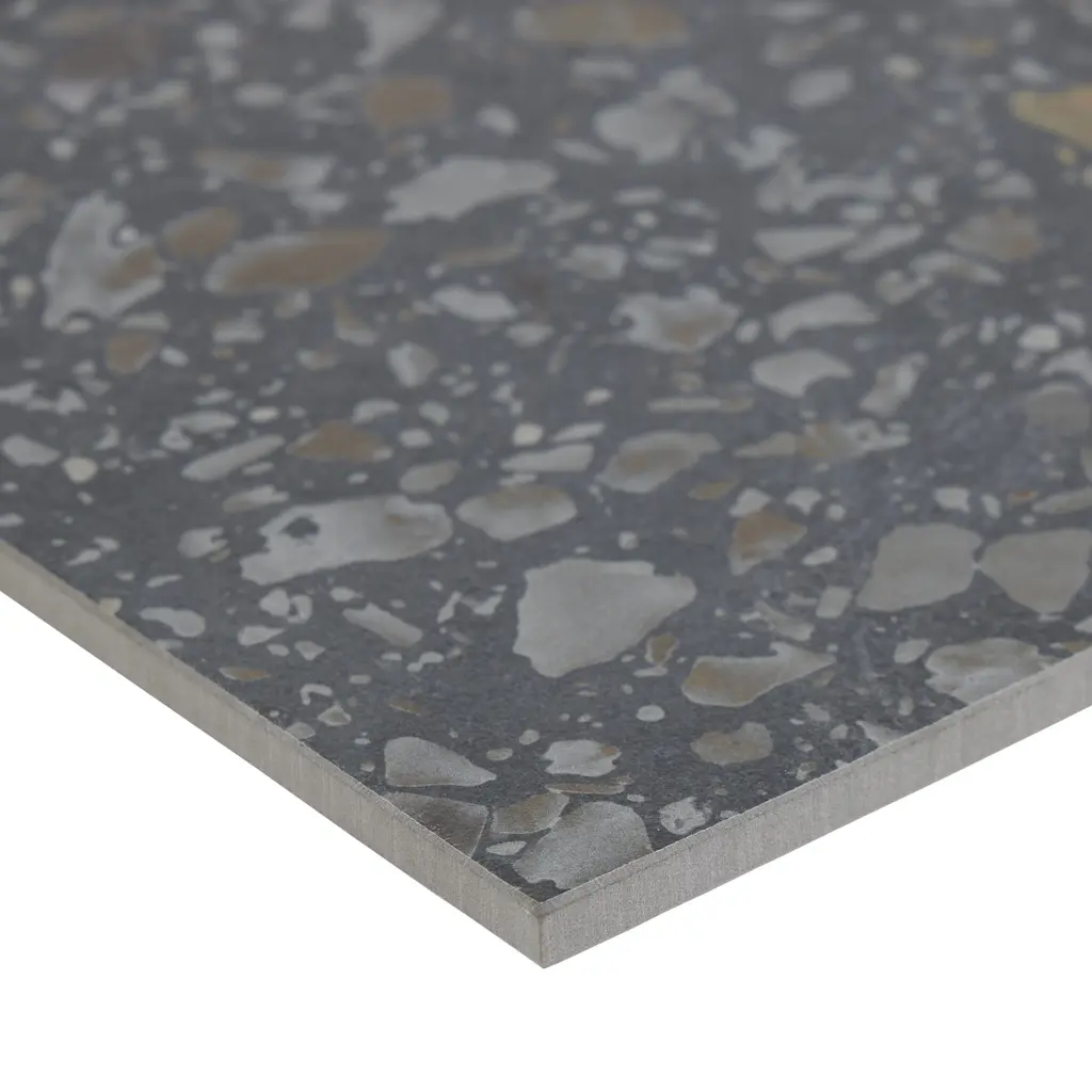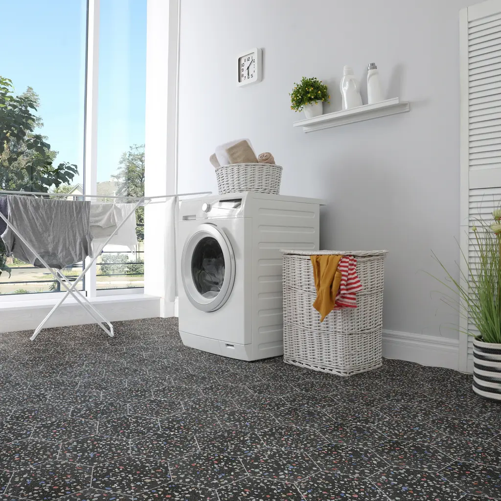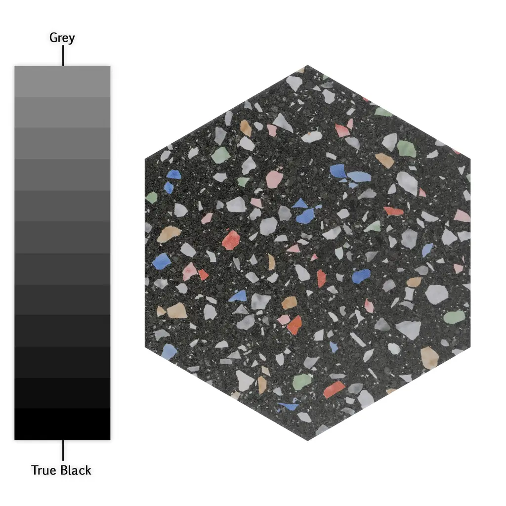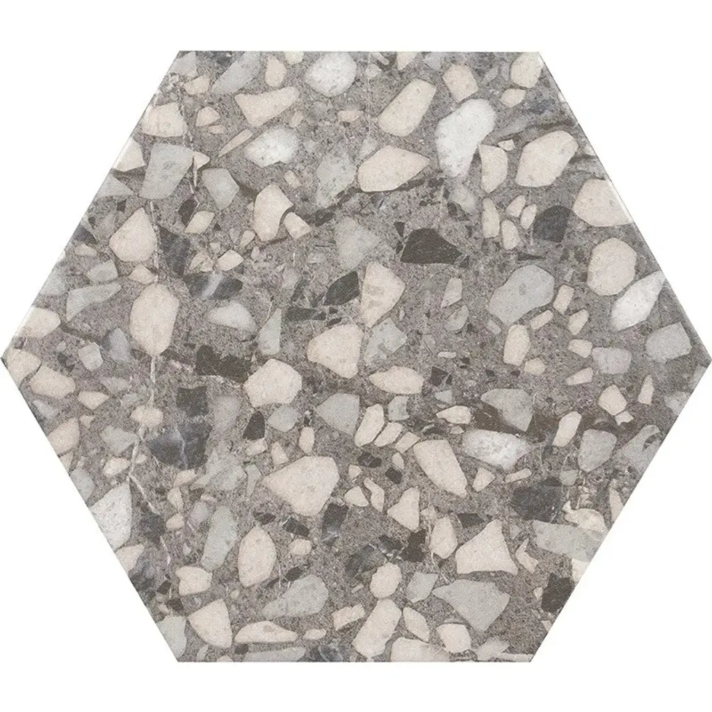 Replicating a terrazzo look, our Venice Hex Colors Dark Porcelain Floor and Wall Tile features a slightly textured, matte finish, providing decorative appeal that adapts to a variety of stylistic contexts. Containing 21 different print variations that are randomly distributed throughout each case, this black hexagon tile offers a one-of-a-kind look. With its impervious, frost-resistant features, this tile is an ideal selection for a variety of spaces including indoor and outdoor residential installations, kitchens, bathrooms, backsplashes, showers, hallways, pools and fireplace facades. This tile is a perfect choice on its own or with other products in the Merola Tile, Venice Collection. To ensure optimal results, please consult with your installer and review the product specifications to confirm that this tile meets the specific needs of your project.