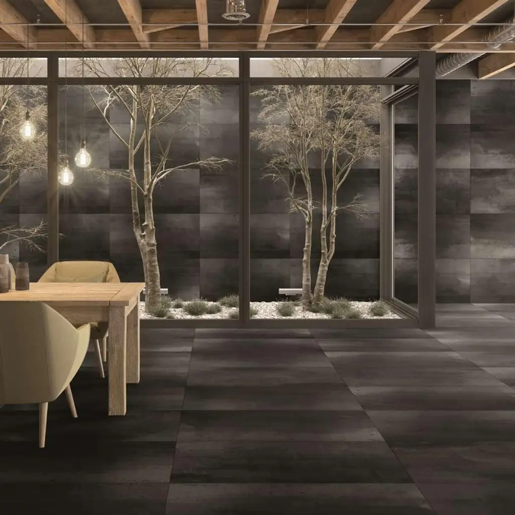 Produced with the modern designer in mind, Metallica offers a dark tile with classic urban elements, forming a unique look unlike any other tile. Metallica's distressed charcoal black coloring gives it the distinctive appeal of a New York contemporary loft. Metallica features a smooth matte finish, furthering its authentic industrial boldness. Beyond its metropolitan style, its durable porcelain material and various size options make it an ideal installation for any indoor or outdoor space. Embrace the essence of aged cement and a modern color palette when you install this tile in your bathroom, kitchen, or outdoor space. FEATURES: DIMENSIONS: