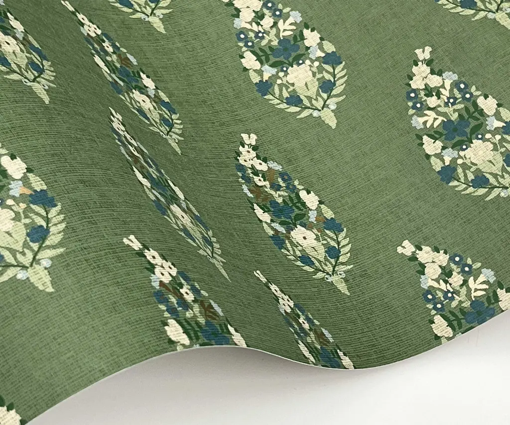 8" x 10" sample of our Paisley wallpaper. Small flowers and leaves create ornamental teardrop shapes on our fresh take on a traditional Paisley print. This wallpaper is screen printed and comes in 27 inch rolls with a 24.25 inch repeat.