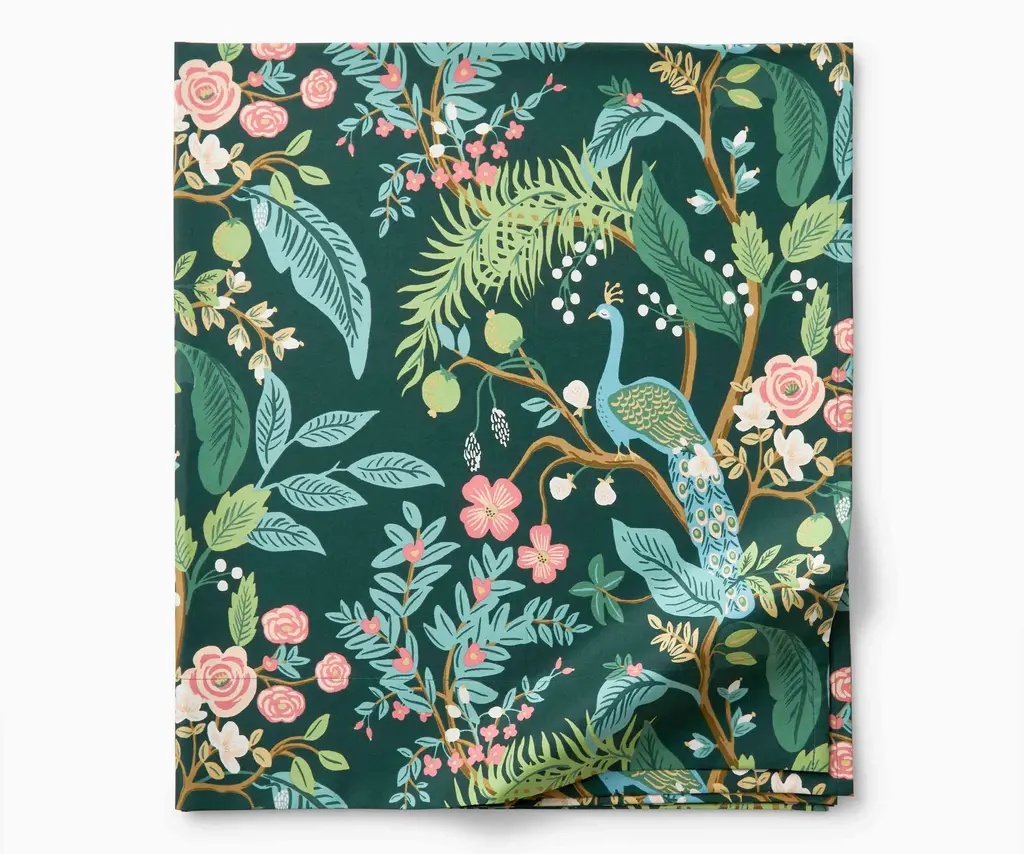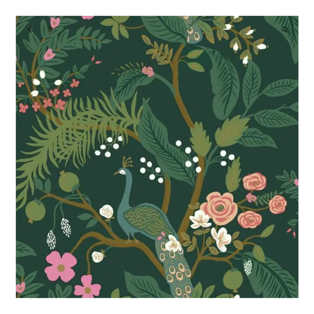 8 × 10" sample of our Peacock wallpaper. Magnificent peacocks perch on winding branches, surrounded by bright blooming flowers and emerald leaves. Inspired by traditional motifs, our modern take is both classic and playful. Please note that wallpaper samples are cut at random, and pattern placement of the sample you receive will not match the photo featured here.