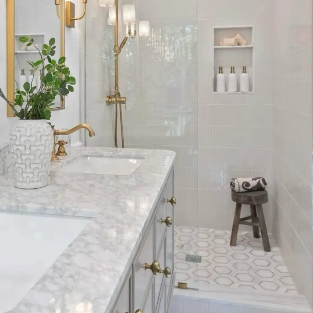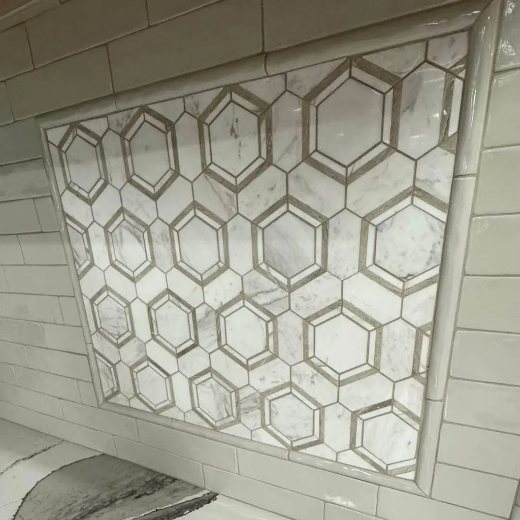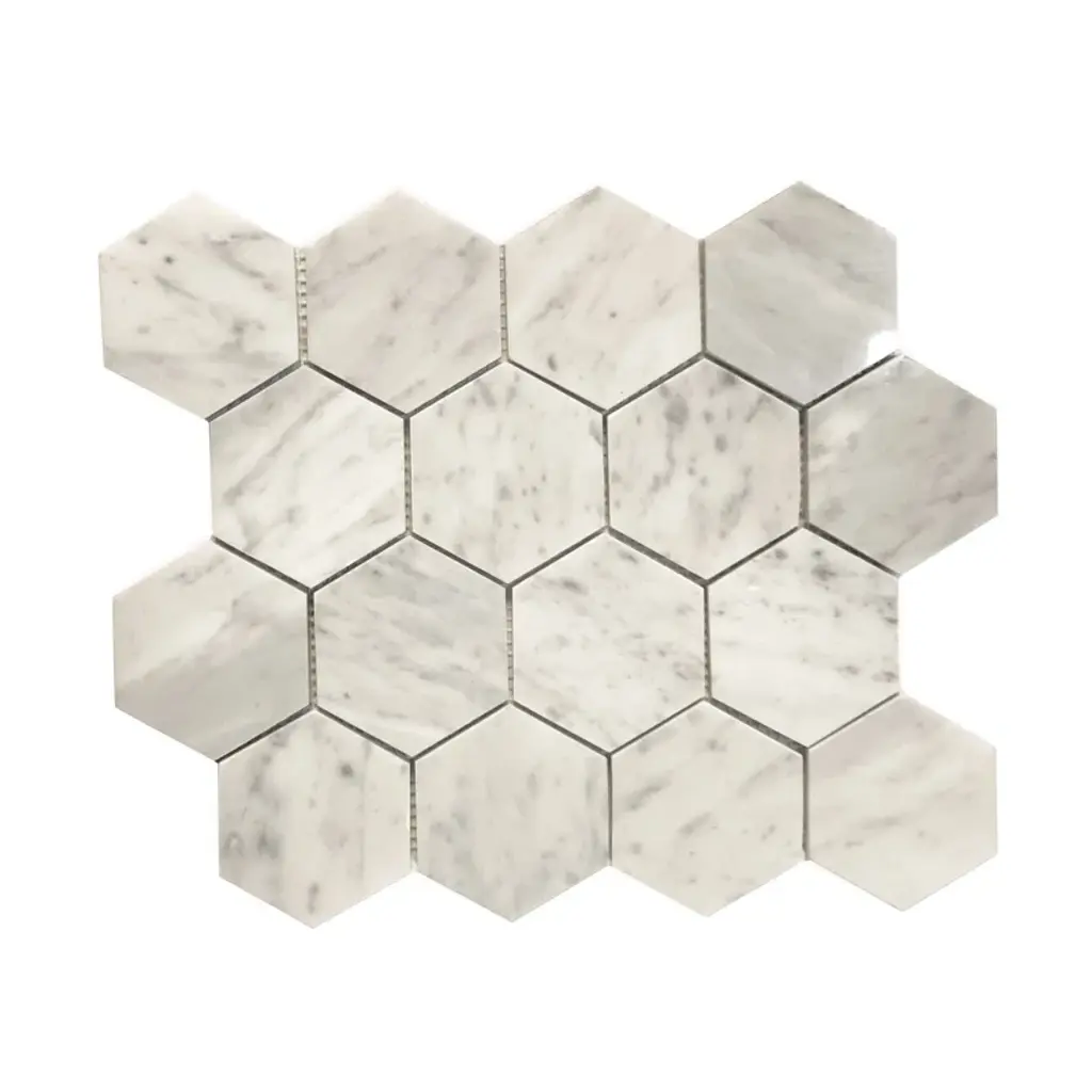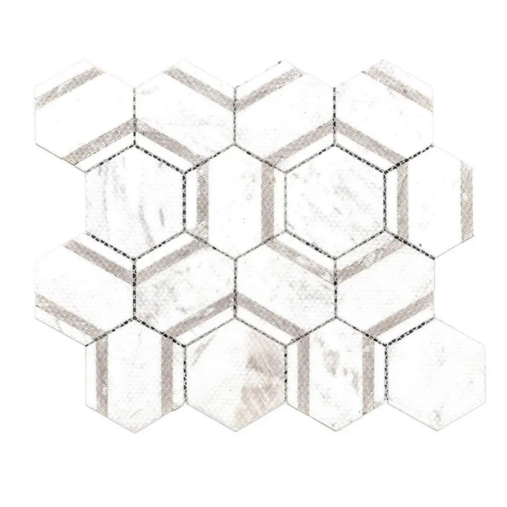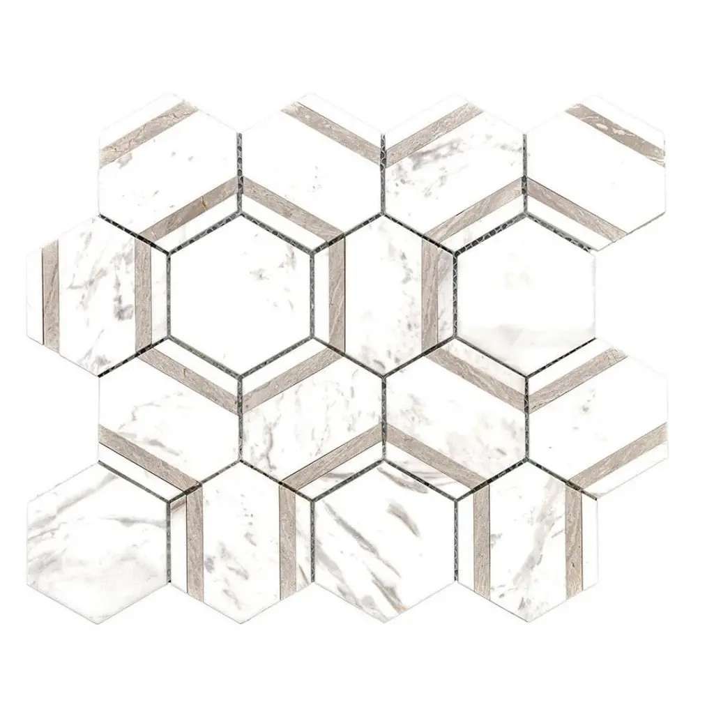 Introducing the Pelta Orb Mosaics Collection: a striking trio of hexagon-shaped tiles crafted from durable polished porcelain. Featuring a modern color palette and a fresh take on the classic hexagon motif, each tile showcases intricate geometric patterns that create a subtle yet captivating focal point. Ideal for both floors and walls, Pelta Orb brings a sleek, sophisticated edge to any space. FEATURES: Each mosaic sheet covers 0.84 square foot (approx.) Marble, meshed backed, hexagon, mosaic, polished, rectified edge tile for floor and wall use Impervious and waterproof; Not suitable for outdoor use but are resistant to most elements Polished finish with a shade 1 rating/ variation - V1 uniform appearance Distinctive art-deco-inspired marble mosaic Shiny polished finish Mesh-mounted, creating a seamless pattern and easy installation Perfect for interior wall or floor installations Great for backsplashes, kitchens, bathrooms, or feature walls Easy to install 13" x 11" decorative porcelain mosaic floor and wall tiles Available in three colors: Blanco Blend, Nero Blend, and Wooden Blend DIMENSIONS: Mosaic sheet: 13 inches L x 11 inches W Surface area per piece: 0.84 square feet