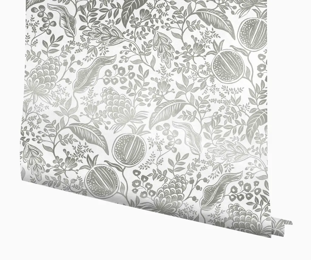 8 × 10" sample of our Pomegranate peel & stick wallpaper. In elevated, two-tone prints, Luscious pomegranates are arranged in a canopy of tropical foliage. Please note that wallpaper samples are cut at random, and pattern placement of the sample you receive will not match the photo featured here.