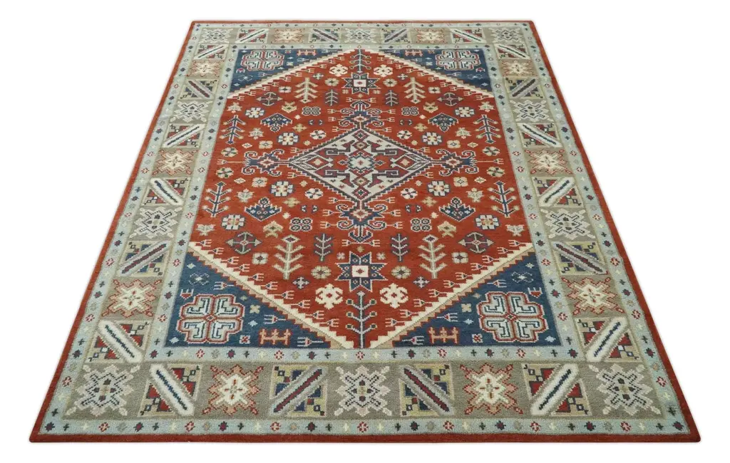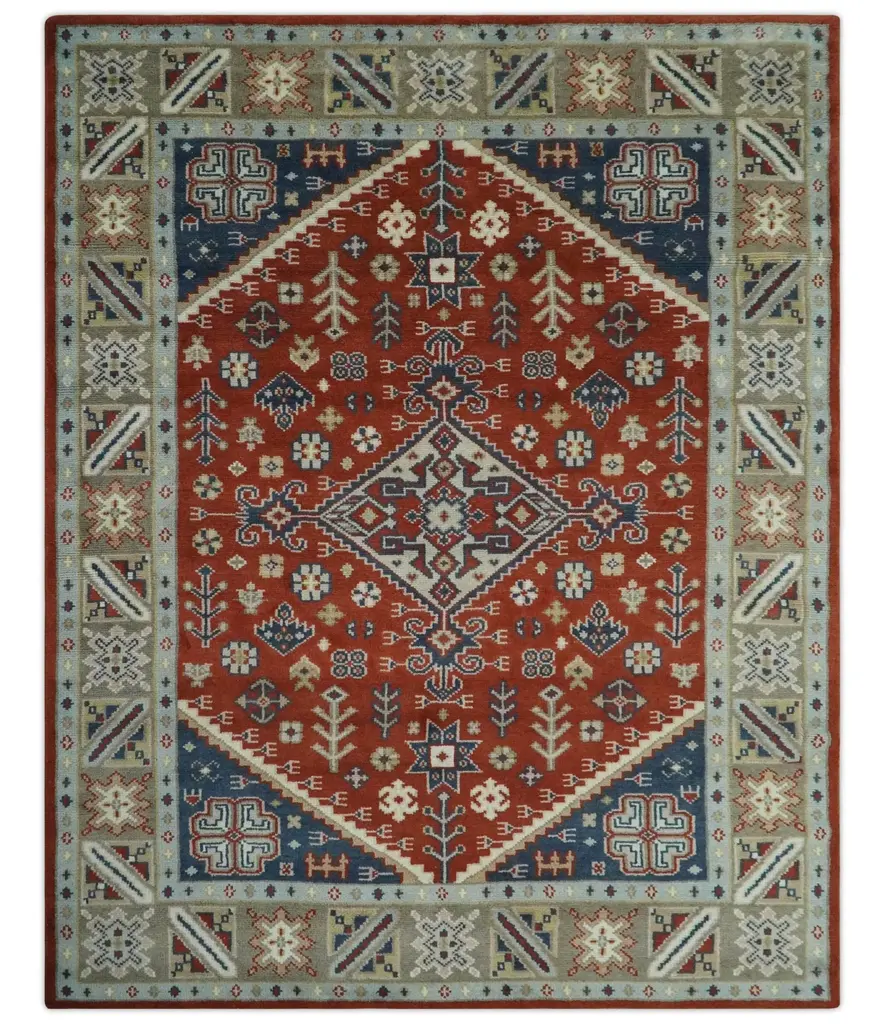 Elevate any space with our Premium Hand Knotted Traditional Heriz Area Rug. Handcrafted with care, this rug boasts a luxurious appearance in Rust, Blue, and Beige. With its traditional design and multi size options, it's the perfect addition to any home. Made from premium quality wool, it guarantees both style and durability. Hand-Knotted Made with Wool Made to Order in 30-45 Days Color : Rust, Blue and Beige This specific rug is made in India, in the city of Bhadohi. Bhadohi is one of the biggest rug manufacturing cities. Carpet weaving in the region dates back to the 16th century during the reign of Akbar. The skilled artisans of Bhadohi have been carrying the tradition of rug-making for centuries. USERS GUIDE Avoid prolonged moisture Vacuum regularly and/or shake to remove dust Do not pull any loose threads. Use scissors to simply cut the ends Blot spills immediately with a white cloth. Harsh chemicals may damage or fade the rug Use rug protectors under heavy furniture