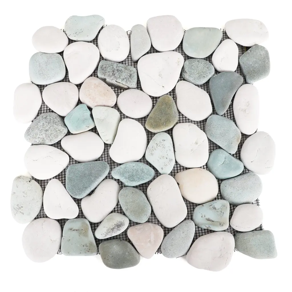 Inspired by The Tile Life Glass Collections, the Recycled Cenote Pebble installations bring you one step closer to the most modern glass kitchen, bathroom, and living room tile decorations. FEATURES: Glass tile for flooring and wall applications Glass pebbles and rocks mosaic tile Mesh backed Impervious and waterproof V3 Moderate variation PEI 2 Matte glass Easy to install 13" x 13" pebbles/ rocks glass tiles Ideal for backsplash, bathroom, shower, floor, wall Recycled Cenote Pebble is offered in Smoke, Blanco, Blend, Charcoal, Crema, Graphite, and Ocean DIMENSIONS: Mosaic sheet: 12.75-inch x 12.75-inch Overall product weight: 57.75 lb. Surface area per carton: 14 square feet