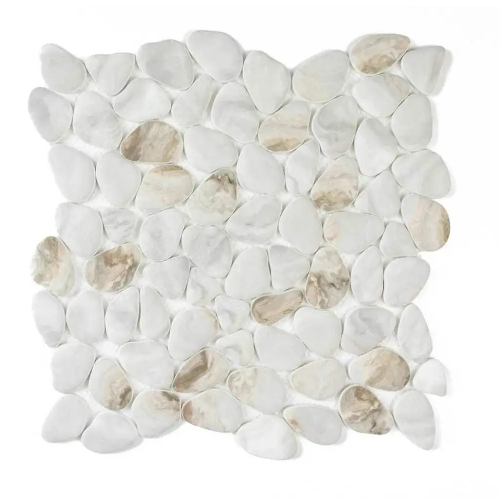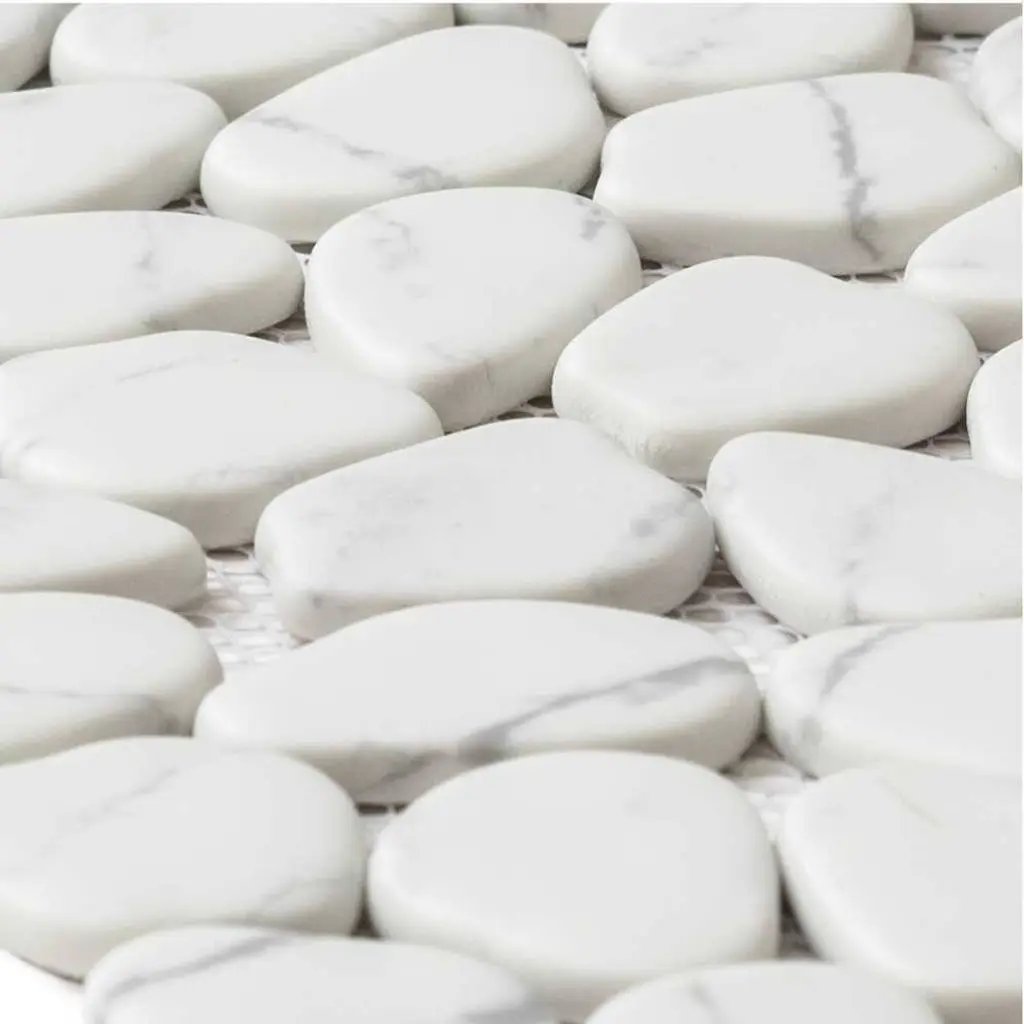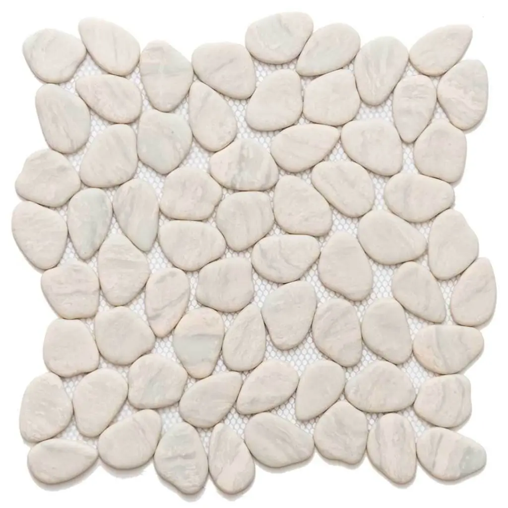 Inspired by The Tile Life Glass Collections, the Recycled Cenote Pebble installations bring you one step closer to the most modern glass kitchen, bathroom, and living room tile decorations. FEATURES: Glass tile for flooring and wall applications Glass pebbles and rocks mosaic tile Mesh backed Impervious and waterproof V3 Moderate variation PEI 2 Matte glass Easy to install 13" x 13" pebbles/ rocks glass tiles Ideal for backsplash, bathroom, shower, floor, wall Recycled Cenote Pebble is offered in Smoke, Blanco, Blend, Charcoal, Crema, Graphite, and Ocean DIMENSIONS: Mosaic sheet: 12.75-inch x 12.75-inch Overall product weight: 57.75 lb. Surface area per carton: 14 square feet