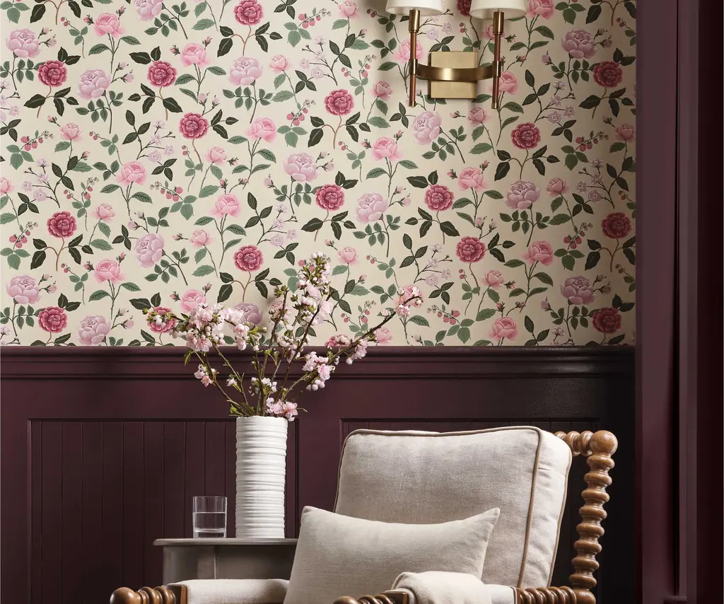 8" x 10" sample of our Roses wallpaper.Inspired by vintage botanical drawings, Roses is a timeless pattern filled with layered details, classic colors, and playful stems of raspberries. This wallpaper is gravure printed and comes in 27 inch rolls with a 24 inch repeat.