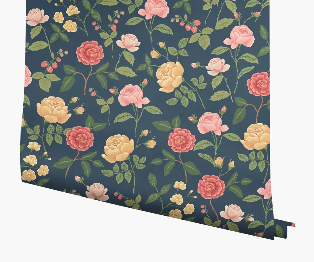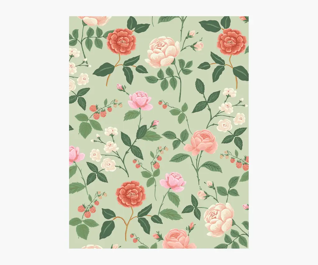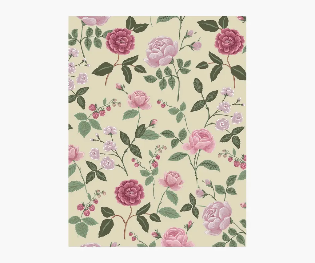 8" x 10" sample of our Roses wallpaper.Inspired by vintage botanical drawings, Roses is a timeless pattern filled with layered details, classic colors, and playful stems of raspberries. This wallpaper is gravure printed and comes in 27 inch rolls with a 24 inch repeat.