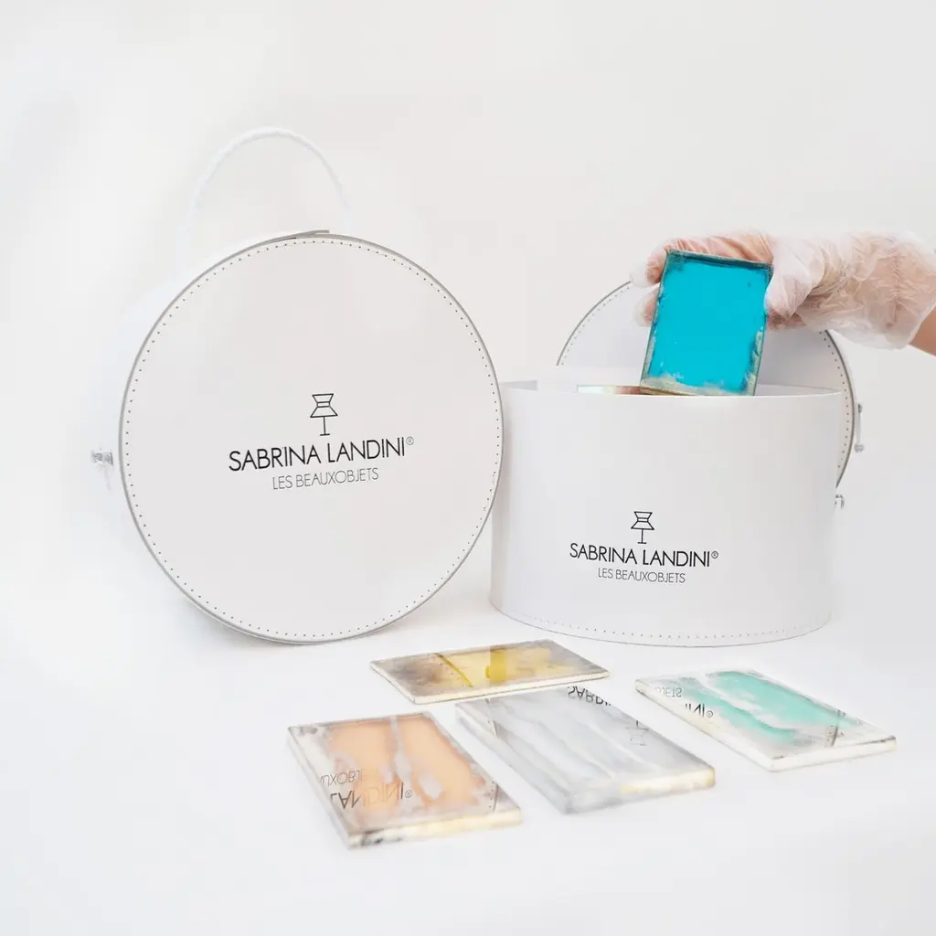 A variety of precious Sabrina Landini's silvered glass samples.Three pieces in total will be provided with this purchase.Make your color selection in the message center.If you need more than 3 colors, please select our complete Sabrina Landini Samples "hat-box", that is listed in 1stdibs platform too. Example is showed here too. Thanks. Sabrina Landini