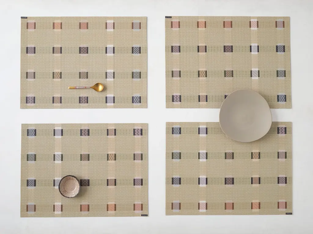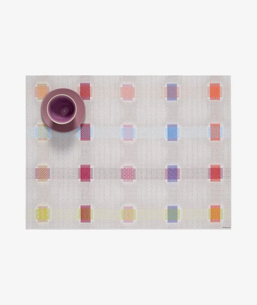 In Sampler, paired rectangles come together, introducing a distinctive weave as they overlap. This dynamic design is inspired by samplers that were used to learn and demonstrate darning: a sewing technique for repairing holes or worn areas in fabric by replicating the structure of the original material. Dating back to at least the 18th century, these samplers typically covered small pieces of cloth in darning "blocks" of various weave structures in a variety of colors—especially blue, green, red, and yellow yarns—to make intricacies visible and show the weaver's skill. For over a decade, New York based designer Sandy Chilewich has been creating original and innovative vinyl products for the home. Her woven, tufted, molded and spun textiles are available in a range of vibrant and neutral hues that have become synonymous with the Chilewich brand name.