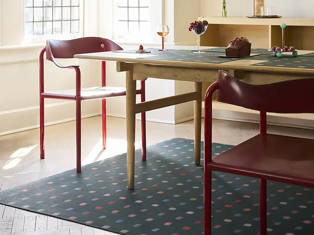 Made from woven textiles, our floor mats are durable, versatile beautiful and easy to clean. Perfect for use in entryways, dining areas, bedrooms, living areas and kitchens. In Sampler, paired rectangles come together, introducing a distinctive weave as they overlap. This dynamic design is inspired by samplers that were used to learn and demonstrate darning: a sewing technique for repairing holes or worn areas in fabric by replicating the structure of the original material. Dating back to at least the 18th century, these samplers typically covered small pieces of cloth in darning "blocks" of various weave structures in a variety of colors—especially blue, green, red, and yellow yarns—to make intricacies visible and show the weaver's skill. TO CLEAN: Vacuum to remove loose dirt or wipe clean with soap, water, and a soft sponge or cloth. Resists stain-causing bacteria, mold, and mildew. For over a decade, New York based designer Sandy Chilewich has been creating original and innovative vinyl products for the home. Her woven, tufted, molded and spun textiles are available in a range of vibrant and neutral hues that have become synonymous with the Chilewich brand name.