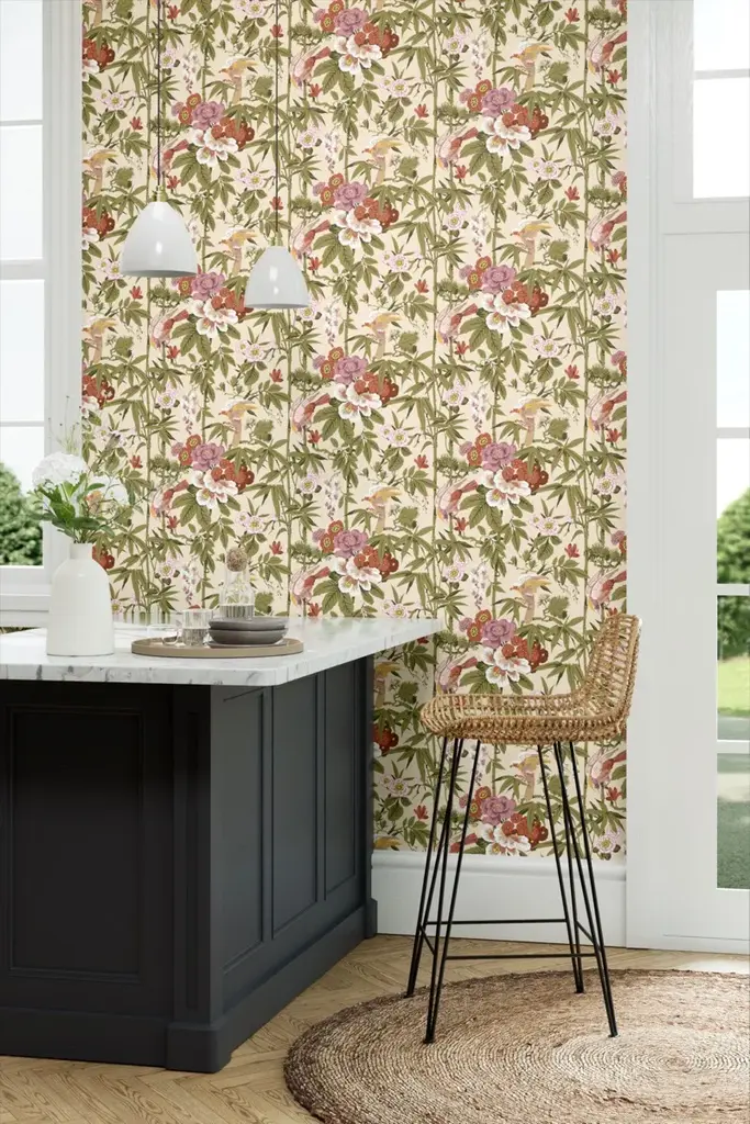 Inspired by a wallpaper from the archive Japanese influences feature in this surface printed design that retains a hand block printed look. An all-over pattern of striped bamboo hibiscus hydrangea and wisteria provide a twisting backdrop to perched exotic birds. Surflex-Printed Wallpaper. Sold by the 11-yard roll. Part of the WATER GARDEN WALLPAPER Collection. Vertical Repeat: 24.0157480314961 Horizontal Repeat: 0 Aftercare Codes: Mod L F / Offset Match / PTW / Sponge