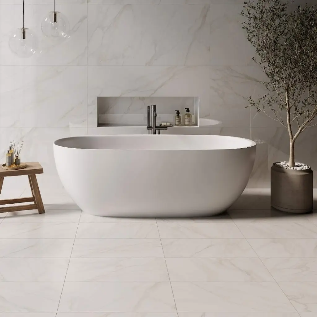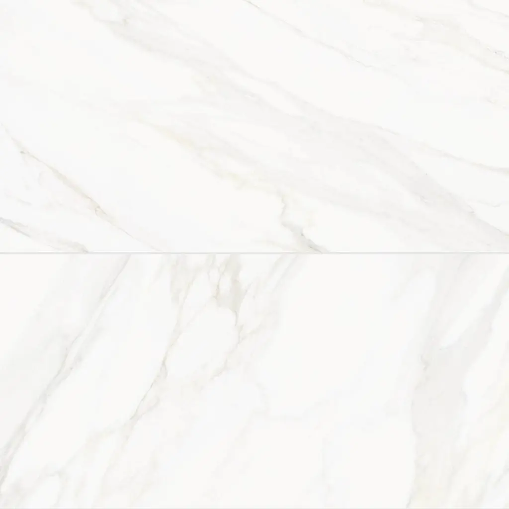 The Savannah tile collection combines the timeless appeal of marble with the durability of porcelain. Featuring a satin and polished finish, this collection is available in two large format sizes—24"x48" and 12"x24"—and showcases a soft white base with subtle veining that offers a natural, marble-like variation. Its versatile design is suited for both commercial and residential applications, making it a practical choice for spaces where elegance and functionality are essential. With its refined look and enduring quality, Savannah brings a sophisticated touch. FEATURES: Premium Porcelain Soft Satin & Polished Finishes Natural, Marble-Inspired Veining Convenient Large Format Sizes (24"x48" & 12"x24") Versatile for Commercial & Residential Spaces A case of this product includes 2 pieces and covers 15.5 square feet Porcelain, singular, large format, rectangle, marble look, satin, rectified floor and tile Impervious and waterproof; Not suitable for outdoor use but are resistant to most elements Satin finish with a V2 slight variation Ideal for bathrooms, kitchens, floors, walls Approved for residential and commercial installations Easy to install 24 inches x 48 inches porcelain tile PEI Rating: 5 - Heavy duty traffic DIMENSIONS: Individual tile size: 24 inches L x 48 inches W Surface area per carton: 15.5 square feet Sample tile size: 4 inches L x 4 inches W