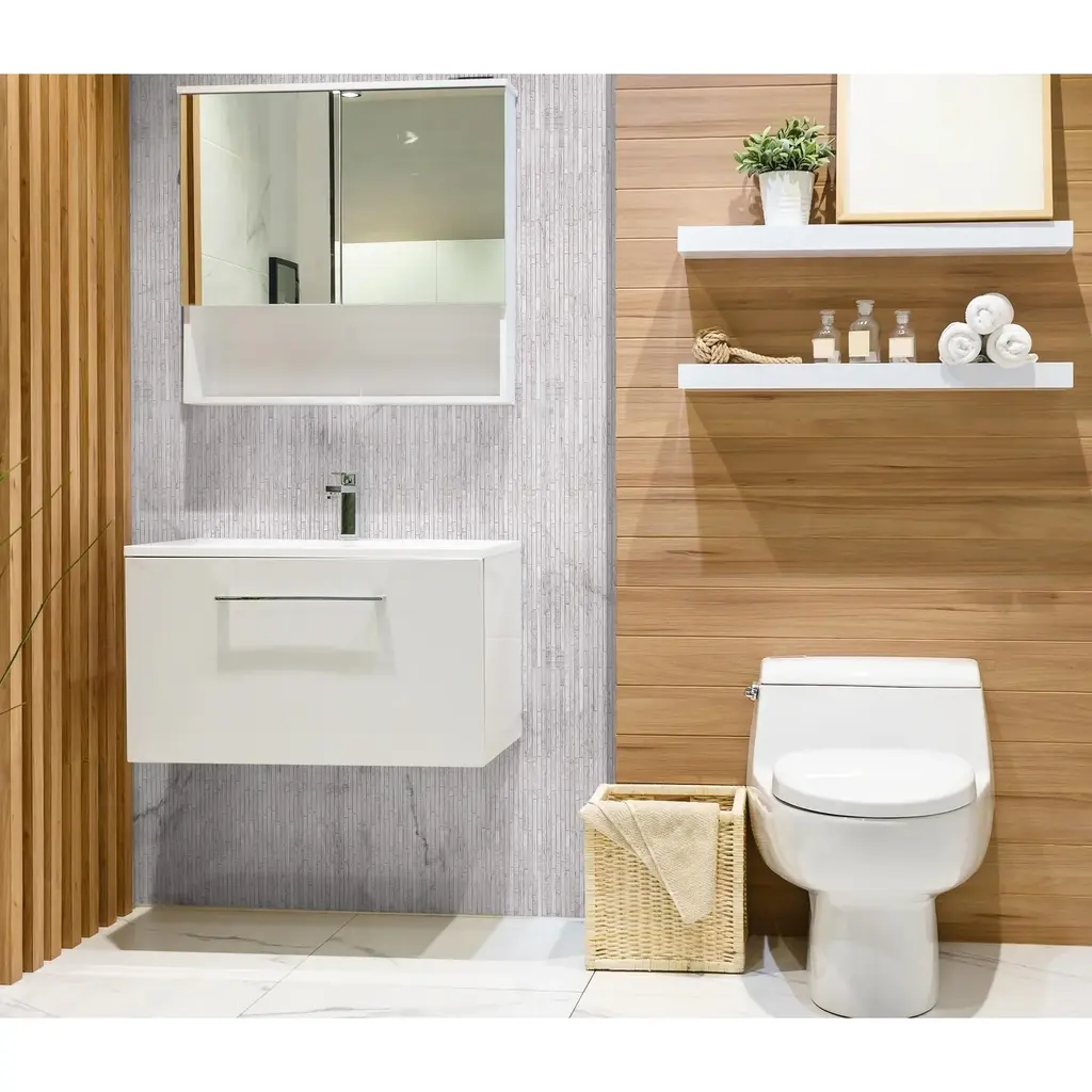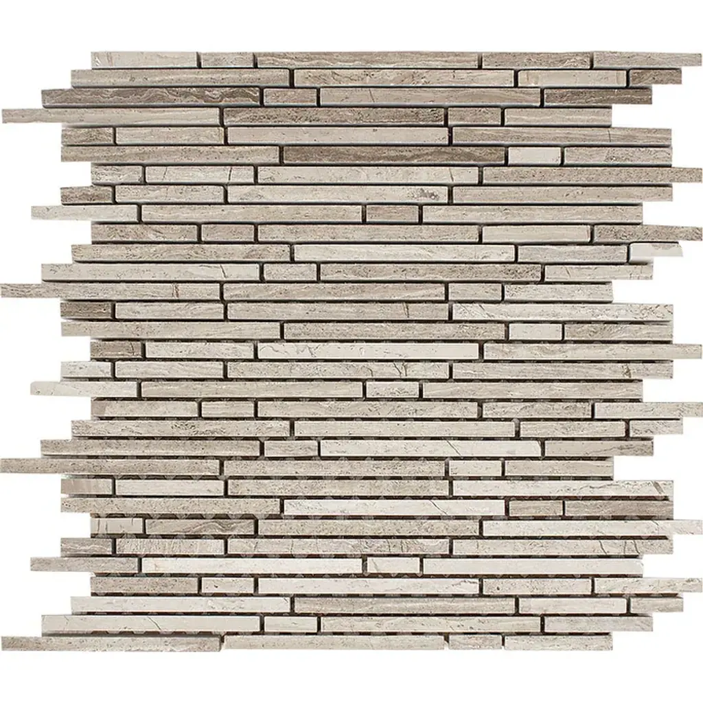 Enhance the beauty of your space with the Slatewood Marble Random Strips Polished Mosaic Tile. This exquisite tile features a mixture of rectangular strips in various shades of gray, imitating the natural allure of wood. Crafted from polished stone, it boasts a glossy, reflective finish that adds a touch of elegance to any room. The random arrangement of the strips creates a one-of-a-kind pattern, perfect for those seeking a contemporary yet organic look. Whether you're designing a feature wall, fireplace surround, or bathroom backsplash, this versatile tile brings depth and texture to your space, making it an excellent choice for both residential and commercial settings.Features:Product Details: