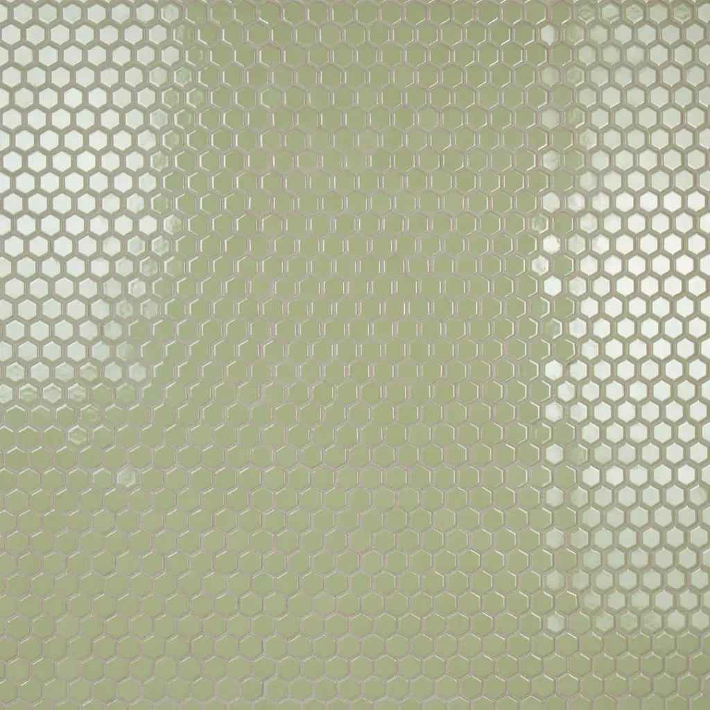 Transform your space into a tribute to retro design with our Metro Hex Glossy Olive Porcelain Floor and Wall Mosaic Tile. As a modern deviation from the classic mosaic, this fresh option is a throwback to traditional retro design with a contemporary feel. Glossy green hexagons are arranged on an interlocking mesh to create a seamless installation. This minimalistic geometric porcelain mosaic is unique yet simplistic enough to integrate into any design, ranging from traditional style renovations to modern home projects. Its impervious and frost resistant features make this an ideal tile for both commercial and residential indoor and outdoor use, including backsplashes, bathrooms, and kitchens. Tile is the better choice for your space. This tile is made from natural ingredients, making it a healthy choice as it is free from allergens, VOCs, formaldehyde and PVC. 8.6 square feet, 10 pieces per case. Case weight is 17.81 lbs. Grade 1, first-quality porcelain tile for floor and wall use 10.25 in. width x 11.88 in. length x 0.22 in. thick mesh-mounted mosaic Glazed, smooth finish with a high sheen and uniform appearance in tone PEI Rating IV has high resistance to abrasion and is suitable for heavy-duty residential and commercial kitchens, hotels, exhibition and sales rooms with some dirt conditions Impervious tiles have a water absorption of less than 0.5% for indoor and outdoor use and are frost resistant This tile has a COF wet rating less than or equal to 0.50 and is considered to have a marginally low skid resistance. This tile is not ADA approved for slip resistance. Completely frost resistant for indoor or outdoor applications; use a latex-modified thinset for acceptable bond strength Please note: A sample of this product may be a partial piece cut from the full size tile in order to provide an affordable and convenient way for customers to judge the quality and finish of this item. Samples are not returnable.