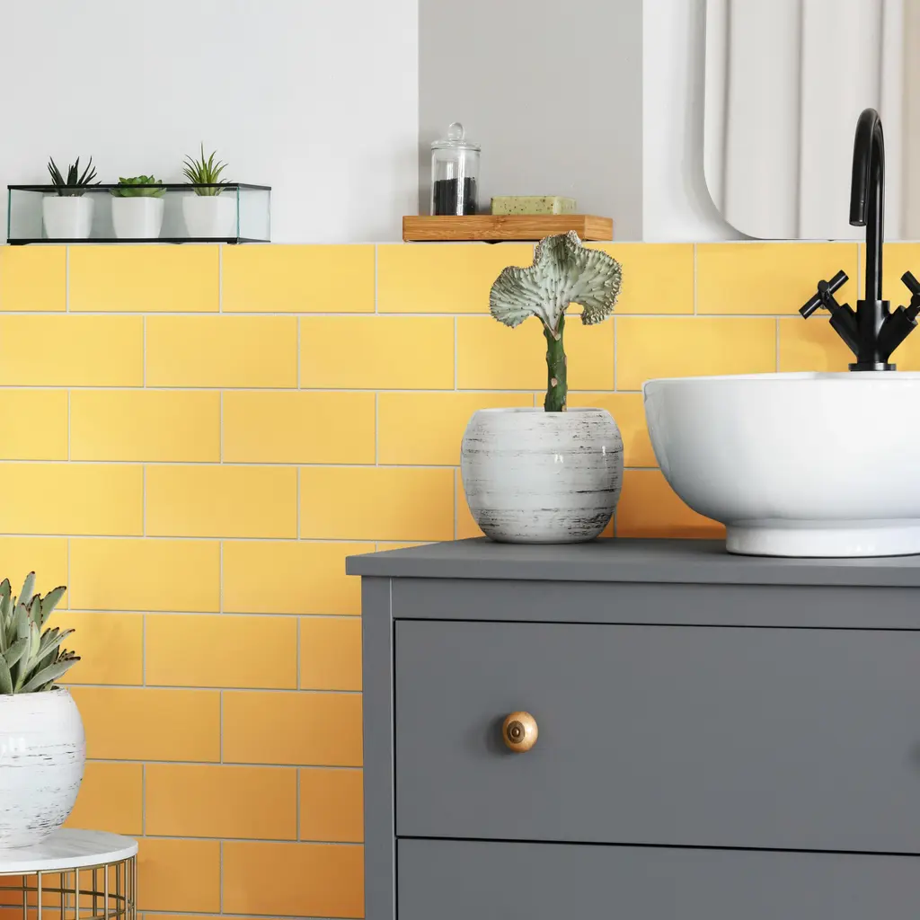 Our Projectos Sunflower Yellow 3-7/8" x 7-3/4" Ceramic Floor and Wall Tile instantly elevates spaces through a refreshing combination of timeless design and vivid color. The bright yellow glaze is uniformly applied to create a striking matte surface that offers eye-catching beauty. Given the versatility of its format, this subway tile is unique yet simple enough to integrate into any design, ranging from traditional style renovations to modern home projects. Intended for both indoor and outdoor residential use, this tile is an ideal choice for kitchen backsplashes, bathroom showers, powder rooms and fireplace facades. This tile is a perfect choice on its own or paired with other products in the Projectos Collection. Tile is the better choice for your space. This tile is made from natural ingredients, making it a healthy choice as it is free from allergens, VOCs, formaldehyde and PVC.10.95 square feet, 50 pieces per case. Case weight is 27.5 lbs. Grade 1, first-quality ceramic tile for floor and wall use. 3.88 in. width x 7.75 in. length x 0.22 in. thick Sample Dimension: A sample of this product may be a partial piece cut from the full size tile in order to provide an affordable and convenient way for customers to judge the quality and finish of this item. Glazed smooth finish with a low sheen and uniform appearance in tone P.E.I. Rating II has high resistance to abrasion and is suitable for heavy-duty residential and commercial kitchens, hotels, exhibition and sales rooms with some dirt conditions all interior walls and light foot traffic such as powder rooms Vitreous tiles have water absorption of more than 0.5% but less than 3% for indoor use and some outdoor applications and is frost resistant Not frost resistant Residential use onlyPlease note: A sample of this product may be a partial piece cut from the full size tile in order to provide an affordable and convenient way for customers to judge the quality and finish of this item. Samples are not returnable.