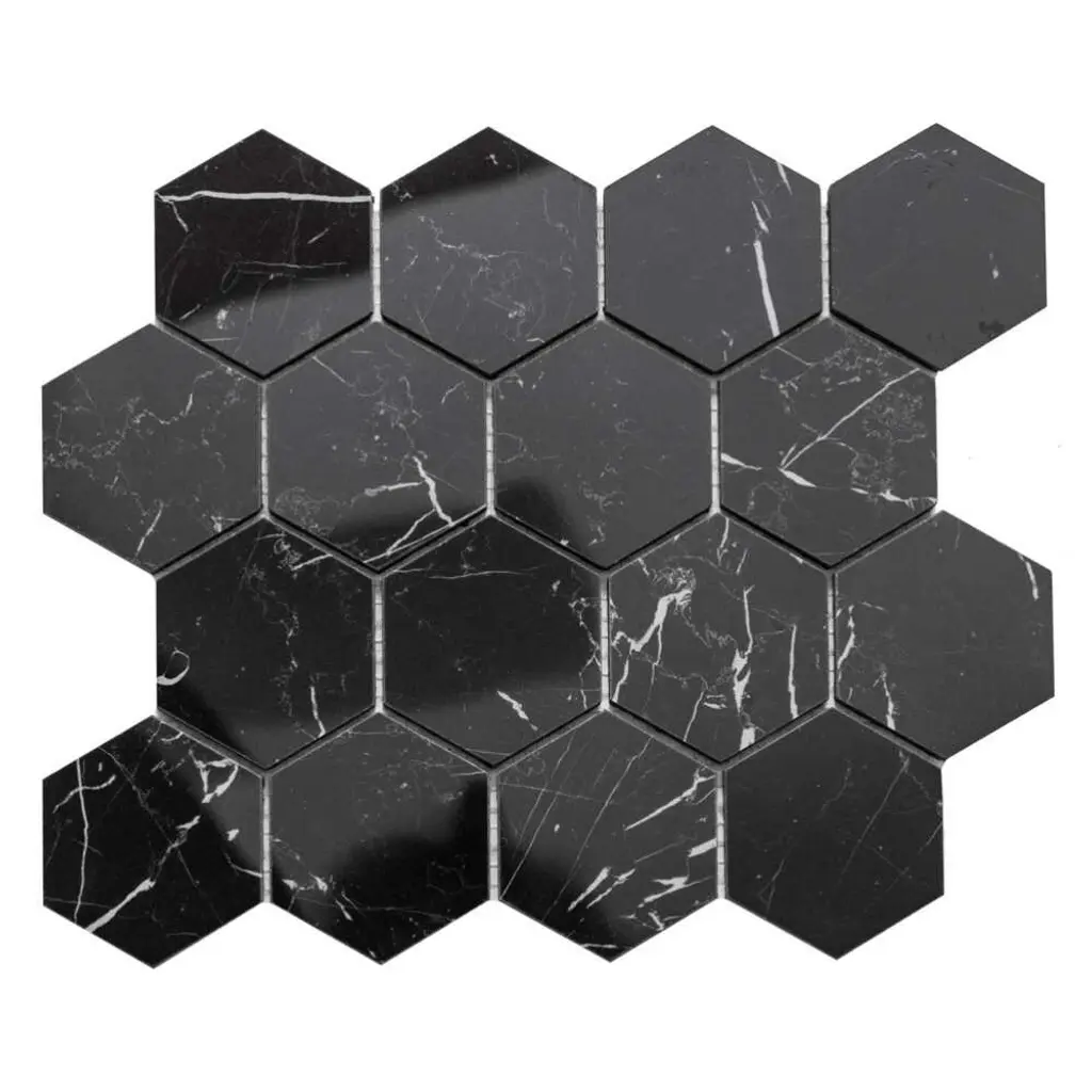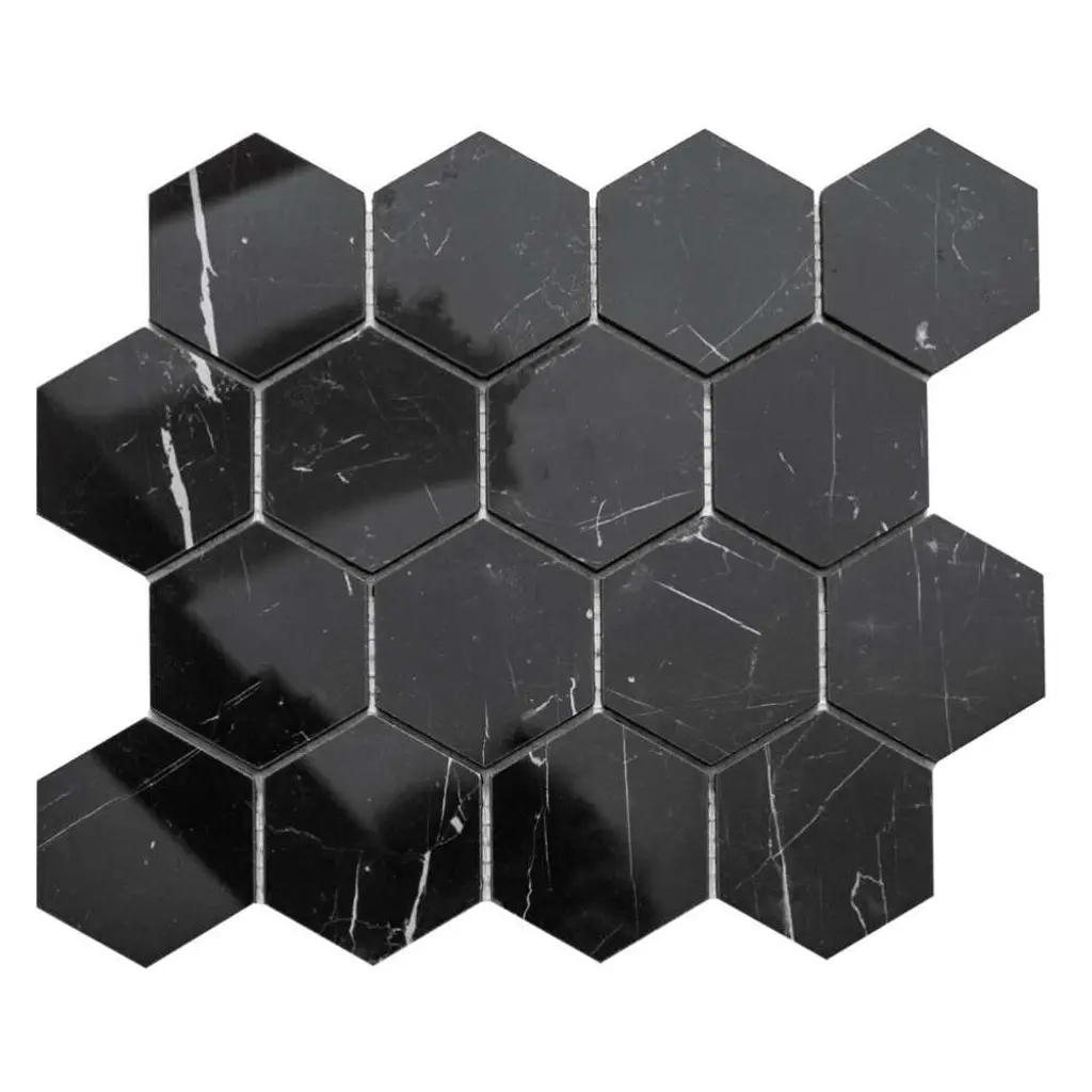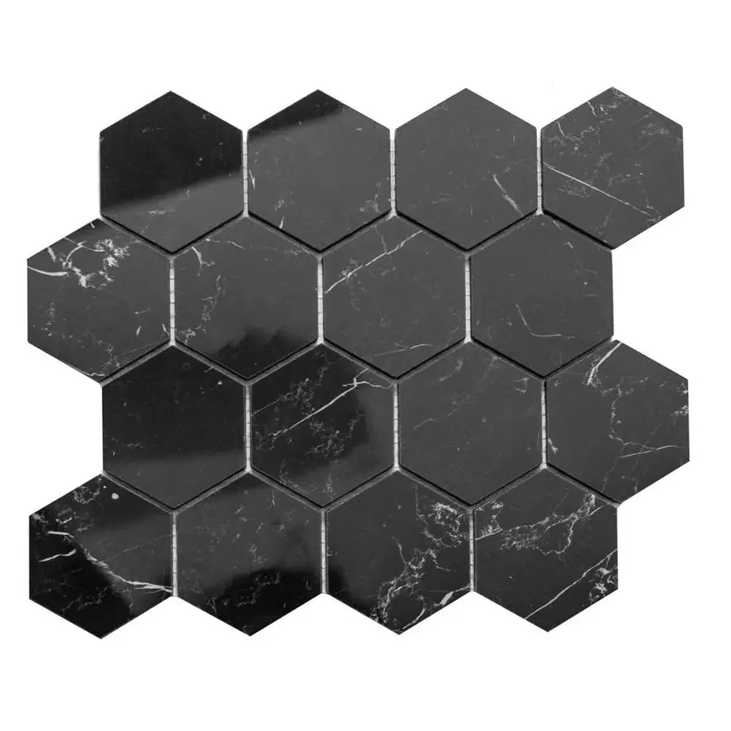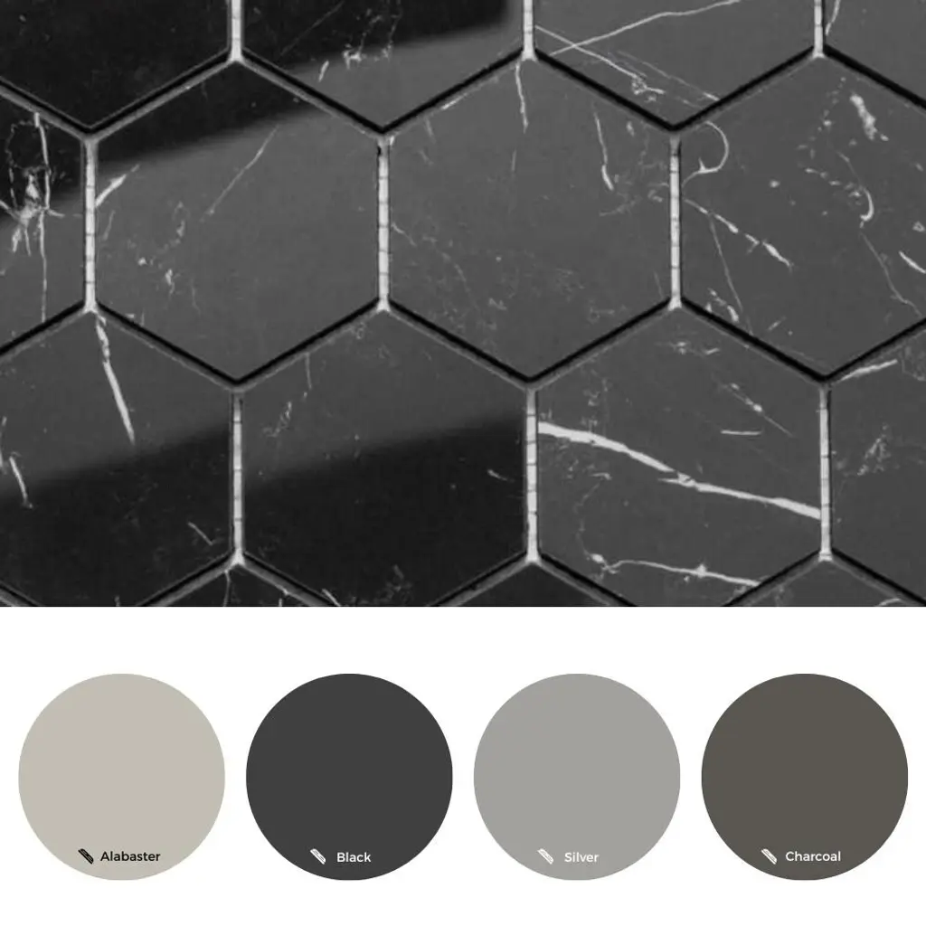 The Tile Life's Stately Hex line is a versatile choice for both classic and contemporary preferences. Our Stately Hex line includes three neutral colors, allowing endless accent color combinations and inspiring creativity in modern designers. Natural veins run through each sheet of tile, creating a unique, different variation on each tile. Place these tiles in any living room, bathroom, kitchen, or foyer for a fun, modern look. The Tile Life's Stately Hex Tile Collection is ideal for backsplashes, bathrooms, showers, kitchens, fireplace surrounds, floors, and walls, these stylish hexagonal tiles offer both beauty and versatility. Available in three sophisticated marble-inspired colors—Pearl Attraction, Nero Marquina, and Calacatta—Stately Hex adds a refined touch to any design. FEATURES: DIMENSIONS: