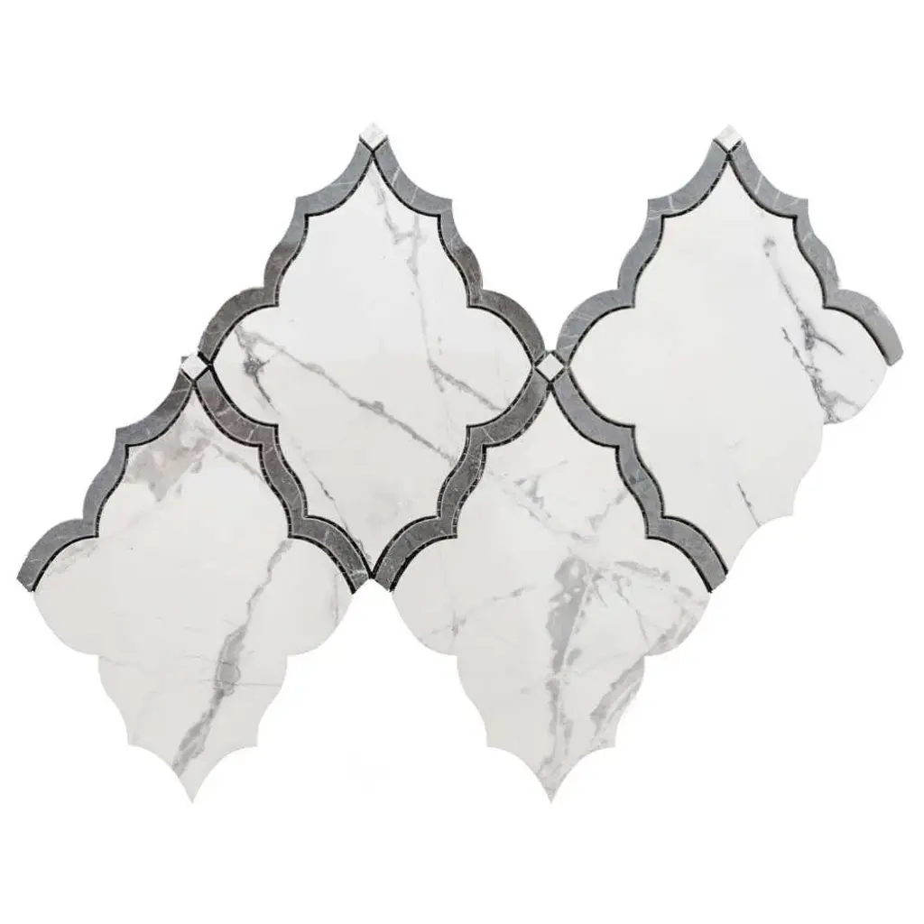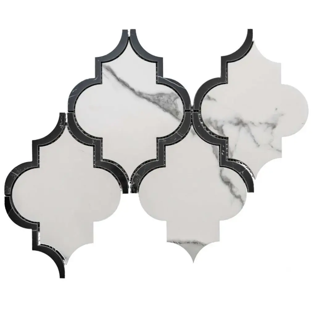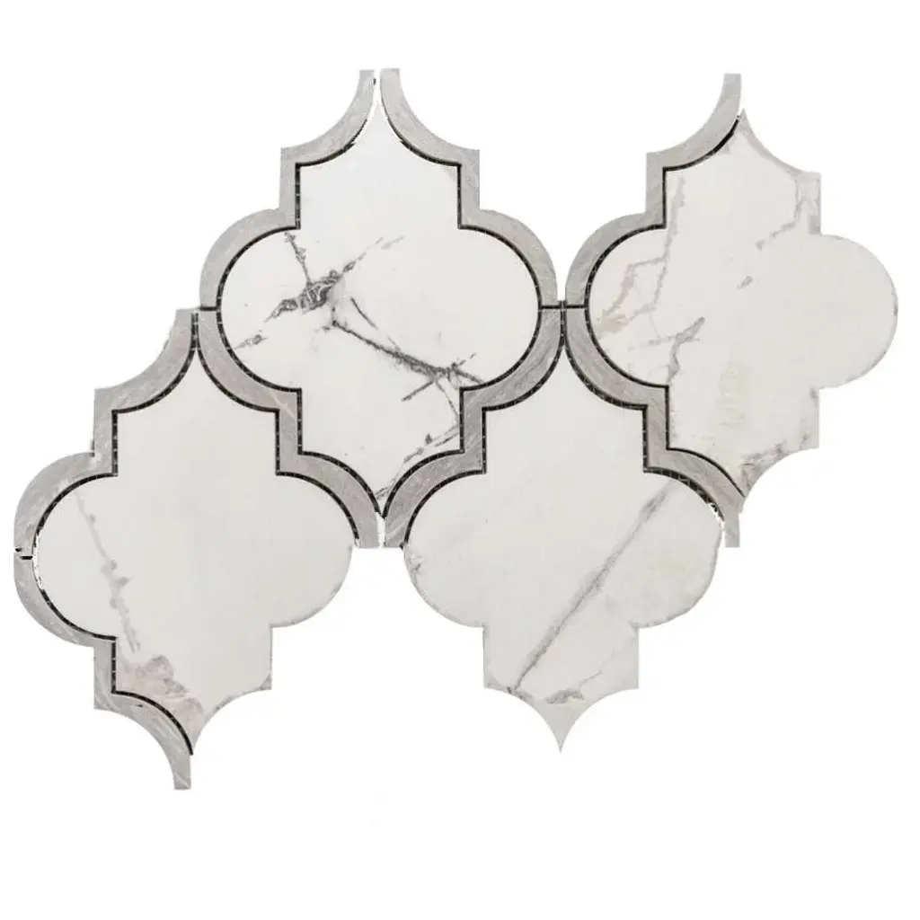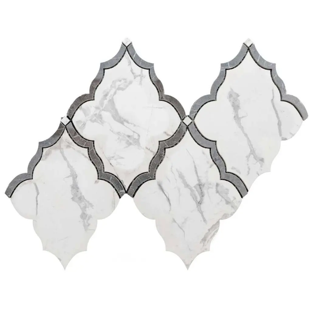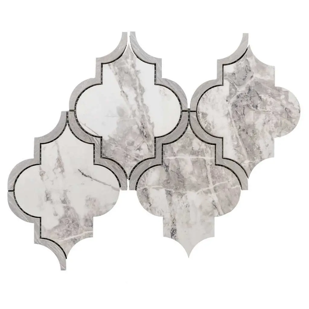 Introducing the Stately Hudson mosaic, a stunning porcelain tile that shines with a glossy finish and iridescent glow. Its lantern shape, gray vein patterns, and elegant silver border add a touch of glamour to any space. This porcelain mosaic tile perfectly combines classic porcelain style with timeless shapes. Use it in your kitchen, bathroom, or shower to create an eye-catching focal point that stands out. This 9.5" x 9.5" decorative porcelain mosaic tile features a stylish Arabesque (Lantern) design, perfect for adding a unique touch to any space. Easy to install and approved for residential and commercial indoor use, it's ideal for backsplashes, bathrooms, showers, kitchens, fireplace surrounds, floors, and walls. FEATURES: DIMENSIONS: