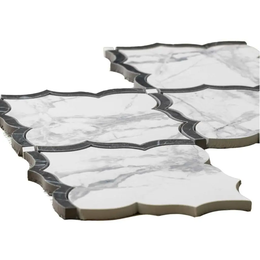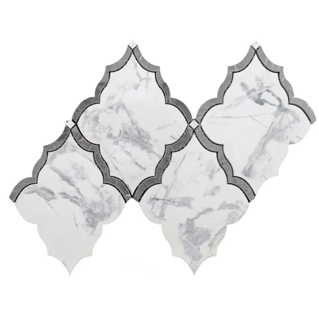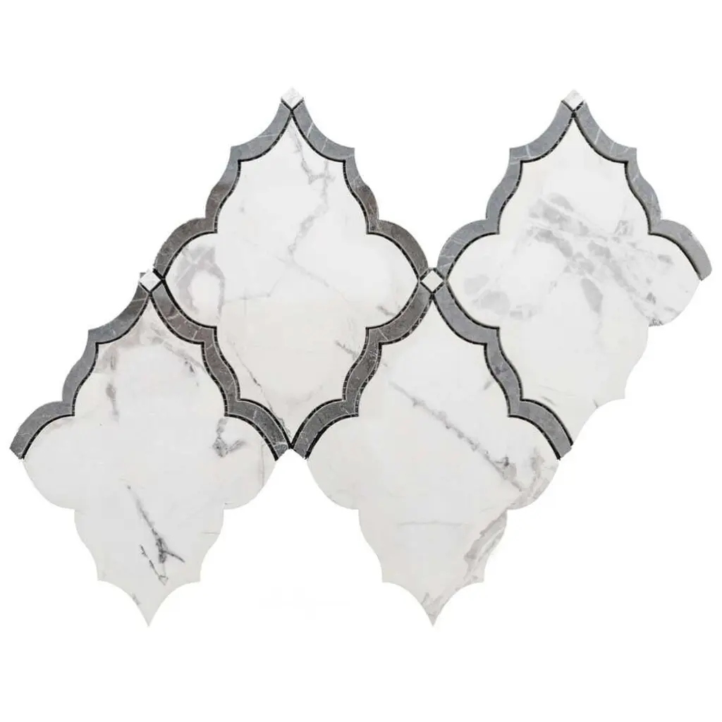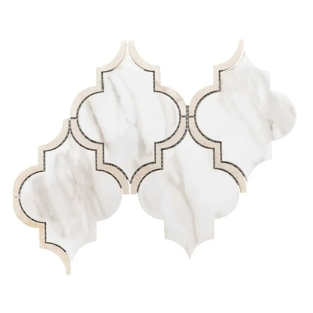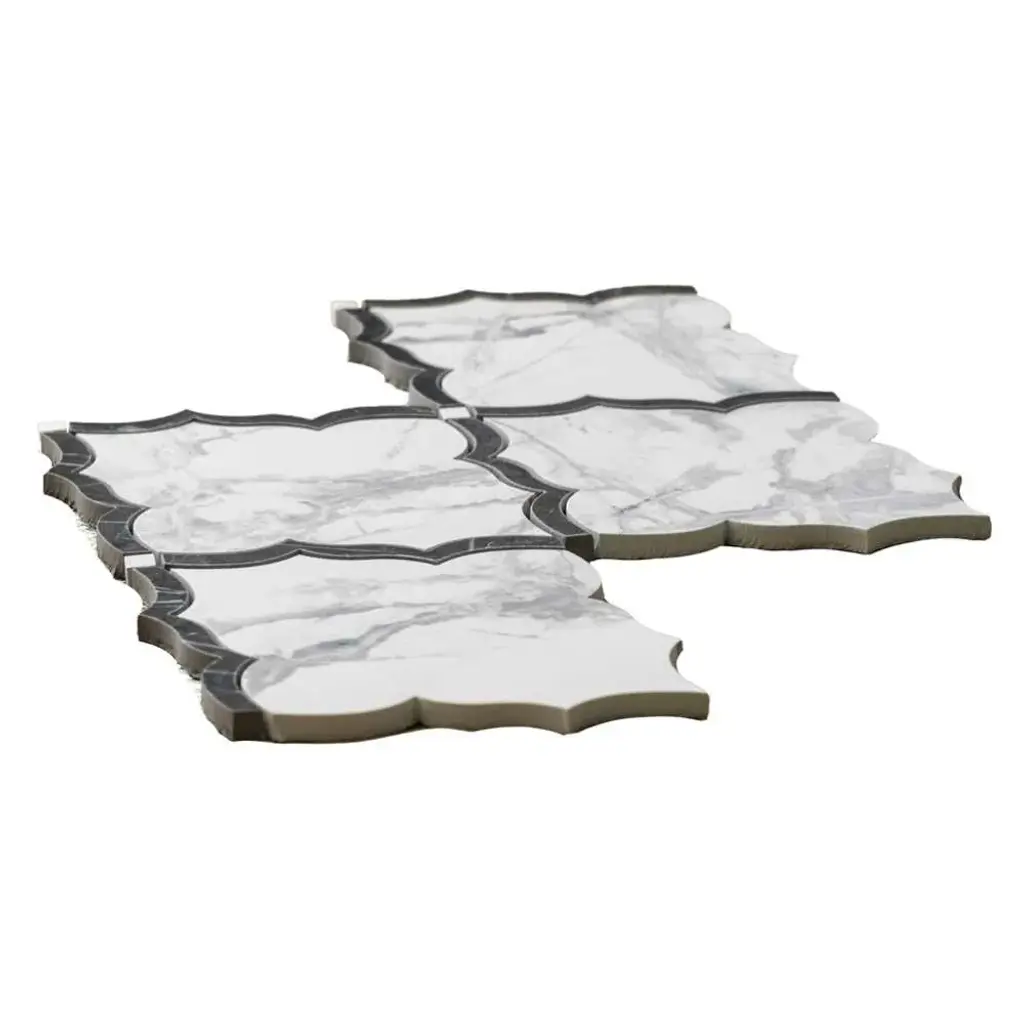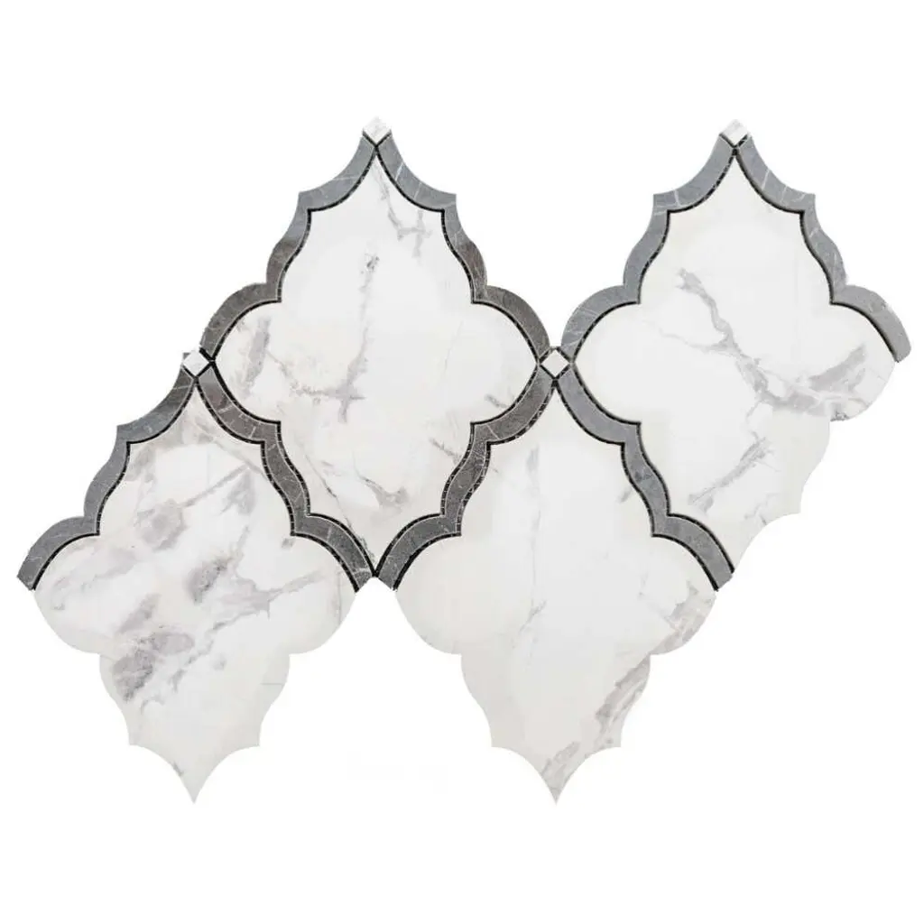Introducing the Stately Hudson mosaic, a stunning porcelain tile that shines with a glossy finish and iridescent glow. Its lantern shape, gray vein patterns, and elegant silver border add a touch of glamour to any space. This porcelain mosaic tile perfectly combines classic porcelain style with timeless shapes. Use it in your kitchen, bathroom, or shower to create an eye-catching focal point that stands out. This 9.5" x 9.5" decorative porcelain mosaic tile features a stylish Arabesque (Lantern) design, perfect for adding a unique touch to any space. Easy to install and approved for residential and commercial indoor use, it's ideal for backsplashes, bathrooms, showers, kitchens, fireplace surrounds, floors, and walls. FEATURES: DIMENSIONS: