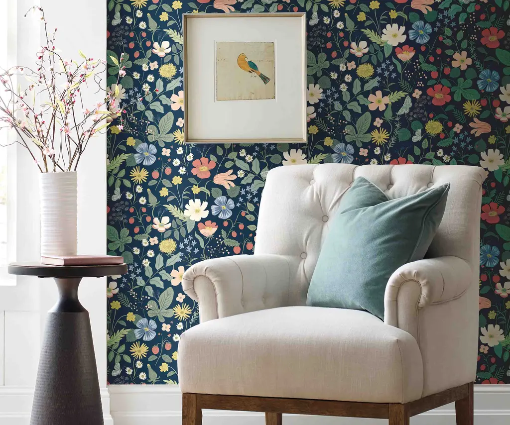 8 × 10" sample of our Strawberry Fields wallpaper. The bright blooms, trailing leaves, and sweet berries of Strawberry Fields create a pattern that will bring cheer to any space, and the occasional fluttering butterfly adds a whimsical accent. This wallpaper is gravure printed and comes in 27 inch rolls with a 24 inch repeat. Please note that wallpaper samples are cut at random, and pattern placement of the sample you receive will not match the photo featured here.