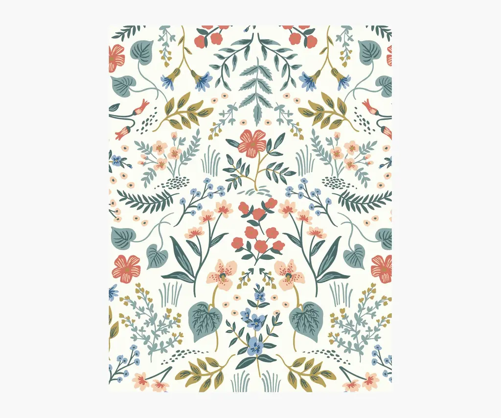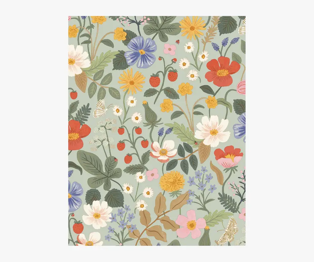 8 × 10" sample of our Strawberry Fields wallpaper. The bright blooms, trailing leaves, and sweet berries of Strawberry Fields create a pattern that will bring cheer to any space, and the occasional fluttering butterfly adds a whimsical accent. This wallpaper is gravure printed and comes in 27 inch rolls with a 24 inch repeat. Please note that wallpaper samples are cut at random, and pattern placement of the sample you receive will not match the photo featured here.