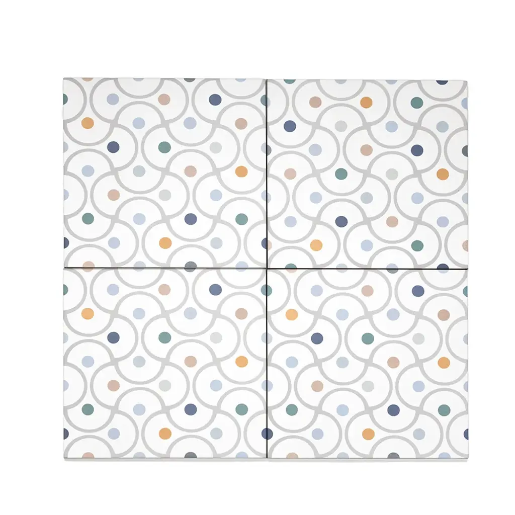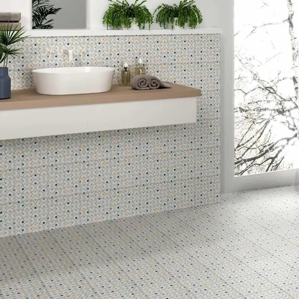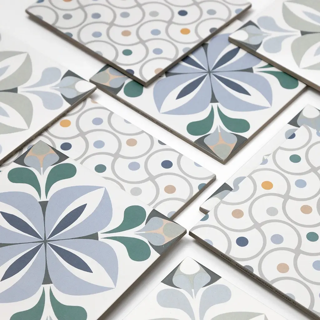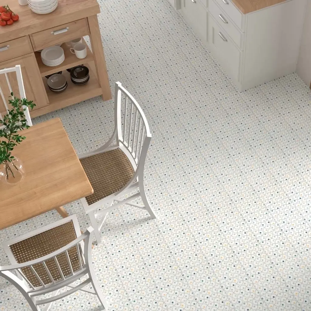 The Summertime collection brings the energy of sunlit days and cool, refreshing waters to any space, blending durability with artistic charm. Made in Spain from sturdy porcelain with a matte finish, these 8x8 tiles are designed to withstand water exposure, making them just as at home in pools and patios as they are in kitchens and bathrooms. The collection offers three distinct styles: Caen, a soft blend of muted blue and sage in a delicate floral motif; Lyons, a lively interplay of bright dots and lines that form a dynamic, woven pattern; and Ruan, where deep blue and dark green florals create a rich, moody elegance. Whether indoors or out, Summertime infuses spaces with movement, color, and a touch of warmth. FEATURES: A case of this product includes 25 pieces and covers 10.76 square feet Porcelain, singular, geometric, encaustic, floral, patterned, matte, pressed, straight edge floor and wall tile Impervious and waterproof; Withstands sun and rain Matte finish with a shade 1 rating/ variation (V1 uniform appearance Made in Spain Crafted from durable, long-lasting porcelain Suitable for water-exposed areas, like pools Features a sleek matte finish Available in three unique styles: Lyons, Caen, and Ruan Modern encaustic patterned tiles Ideal for both interior and exterior spaces Versatile 8" x 8" size for easy installation This product has a PEI rating of 3 (endurance and hardness indicator) and therefore is suited for residential countertops, walls, and medium-traffic floors Ideal for backsplashes, bathrooms, showers, kitchens, outdoors, pools, floors, walls Approved for residential and commercial installations Easy to install 8 inches x 8 inches decorative geometric, floral pattern porcelain floor and wall tile DIMENSIONS: Individual tile size: 8 inches L x 8 inches W Surface area per carton: 10.76 square feet Sample tile size: Full size 8 inches L x 8 inches W