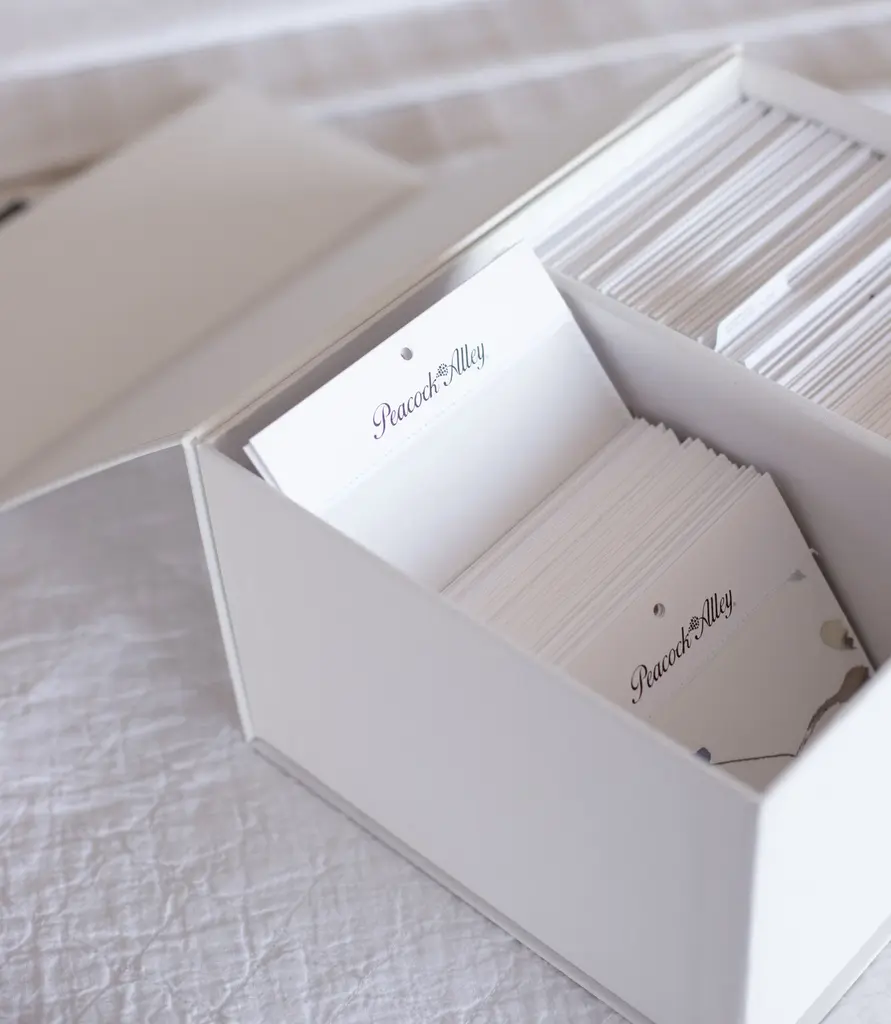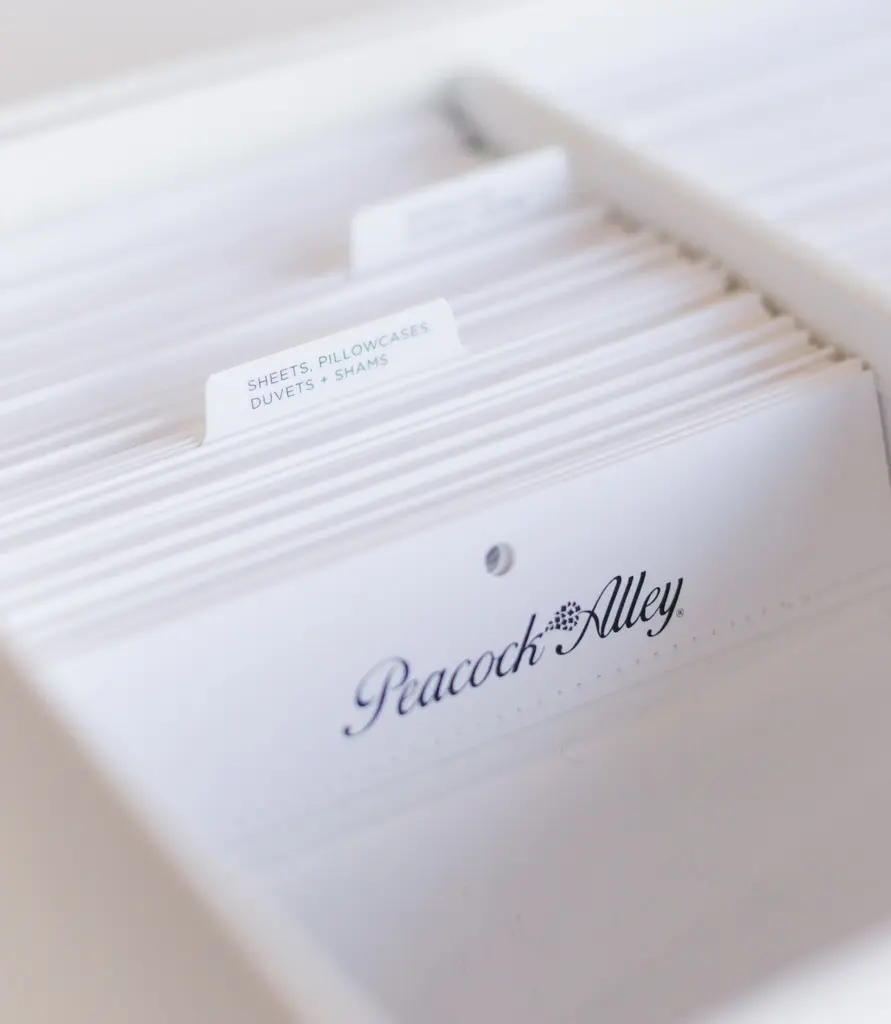 See and feel the difference with the Peacock Alley swatch box. Featuring samples in every color of our expansive collection of luxury linens; specifying sheets, blankets, coverlets and duvets for you next project has never been easier. This aesthetically pleasing box has a magnetic closure and is sized appropriately to be stored on shelves in your workspace. The box arrives organized by category and color, but can be reordered to your liking and has ample space for swatches from future Peacock Alley collections.