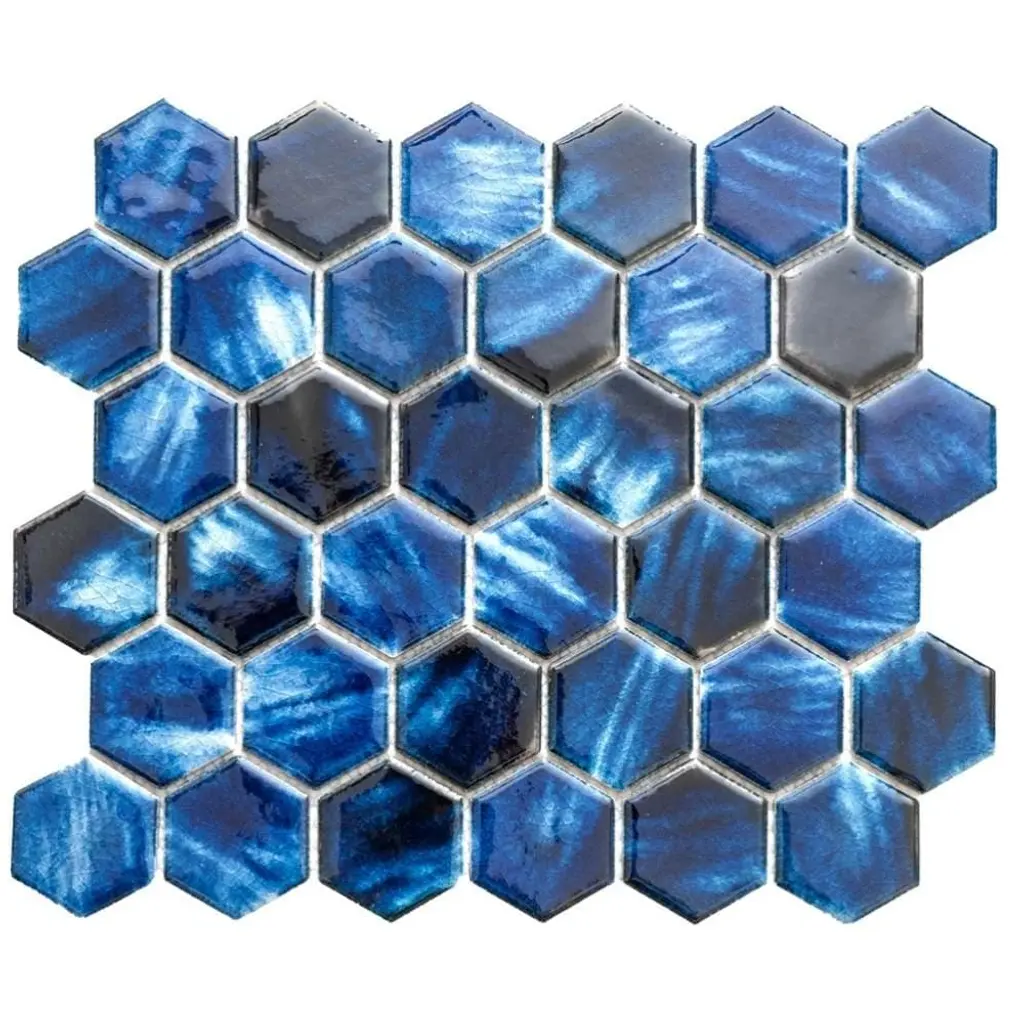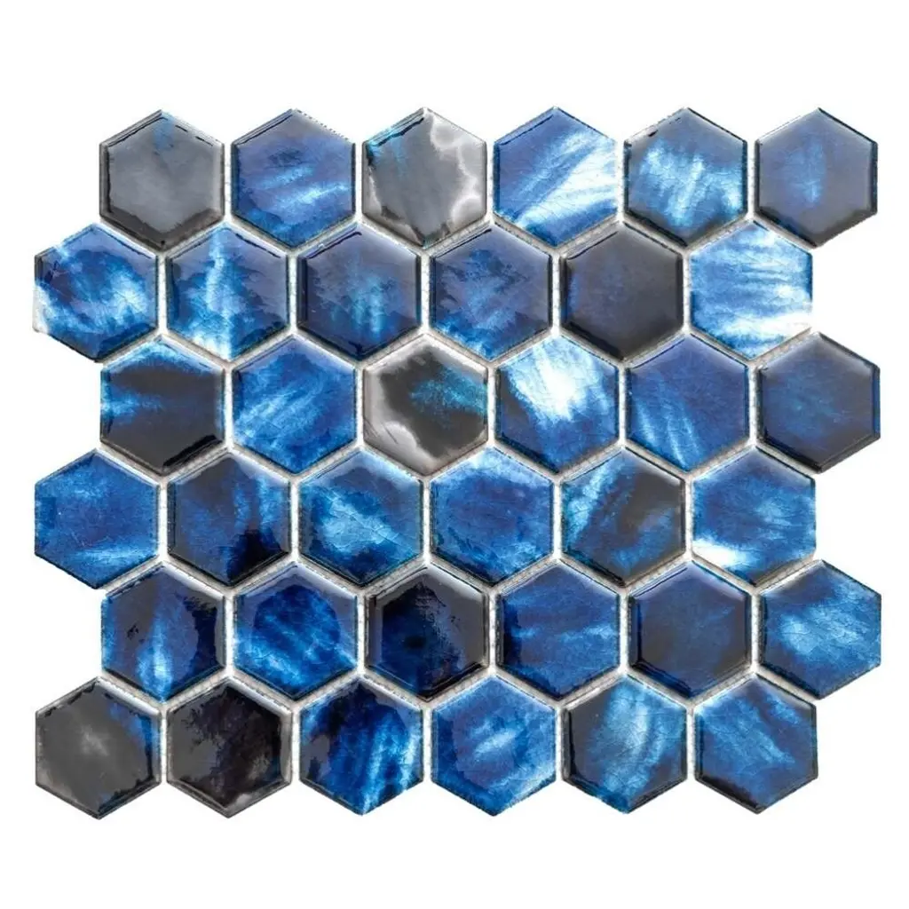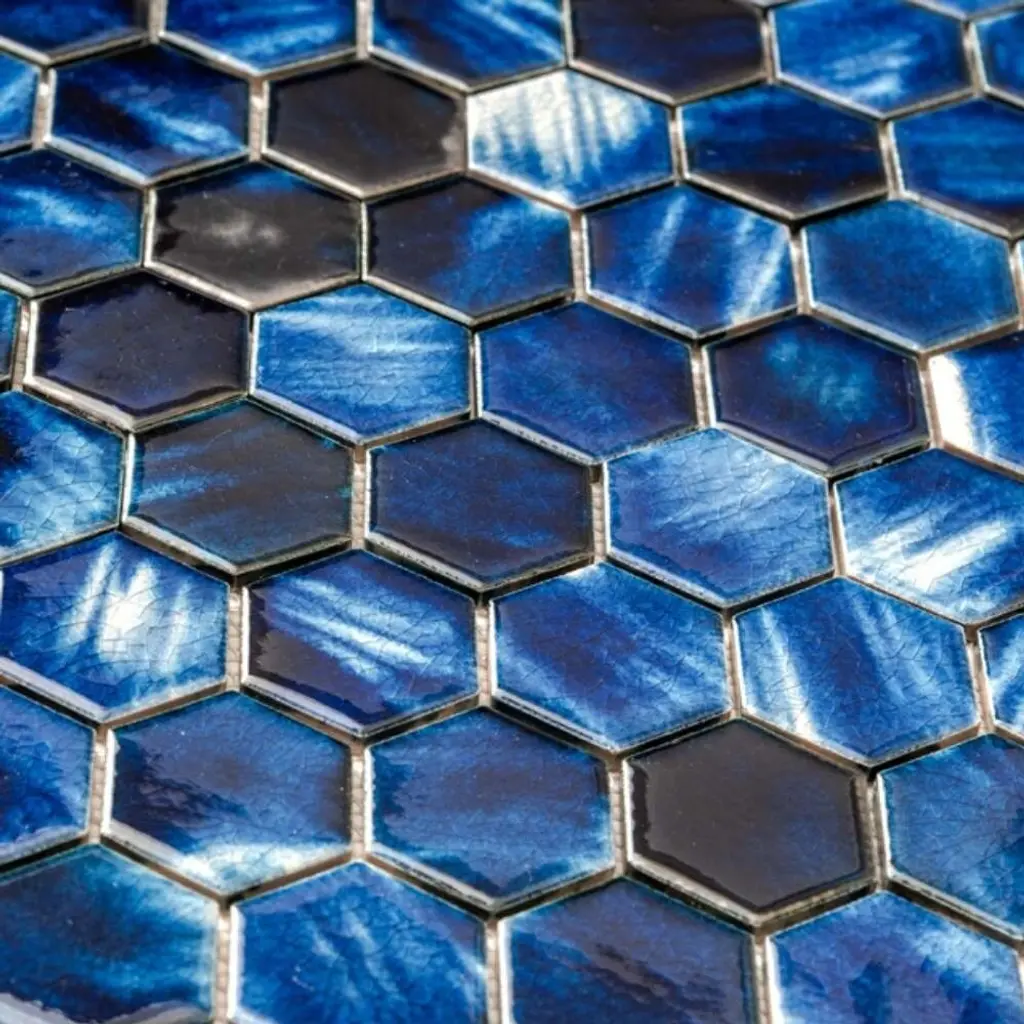 Experience a symphony of sophistication with our Agate Collection, boasting a reflective glossy finish that adds a touch of luxury to any space. Crafted with an artisanal touch, the Agate tiles offer a bold yet refined aesthetic. Each tile is a masterpiece with vibrant, crackled colorways arranged in a mesmerizing hexagon format accentuated with unique metal tones. With its distinctive metallic crackle and watercolored color variation, Agate distinguishes itself from the traditional hexagon mosaic, making it the perfect installation for any bathroom or kitchen space.
