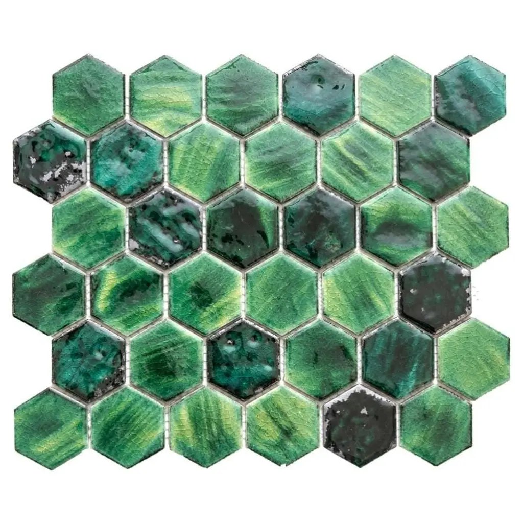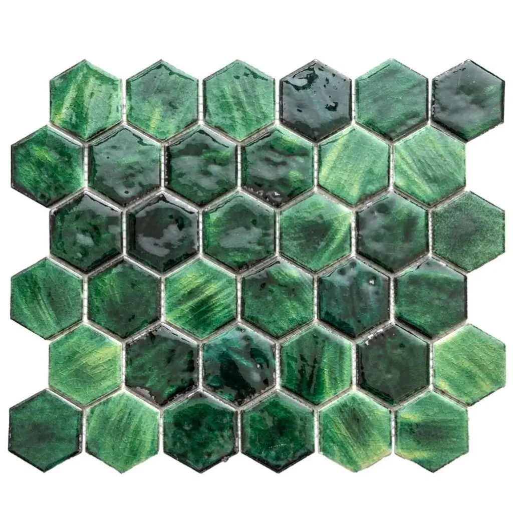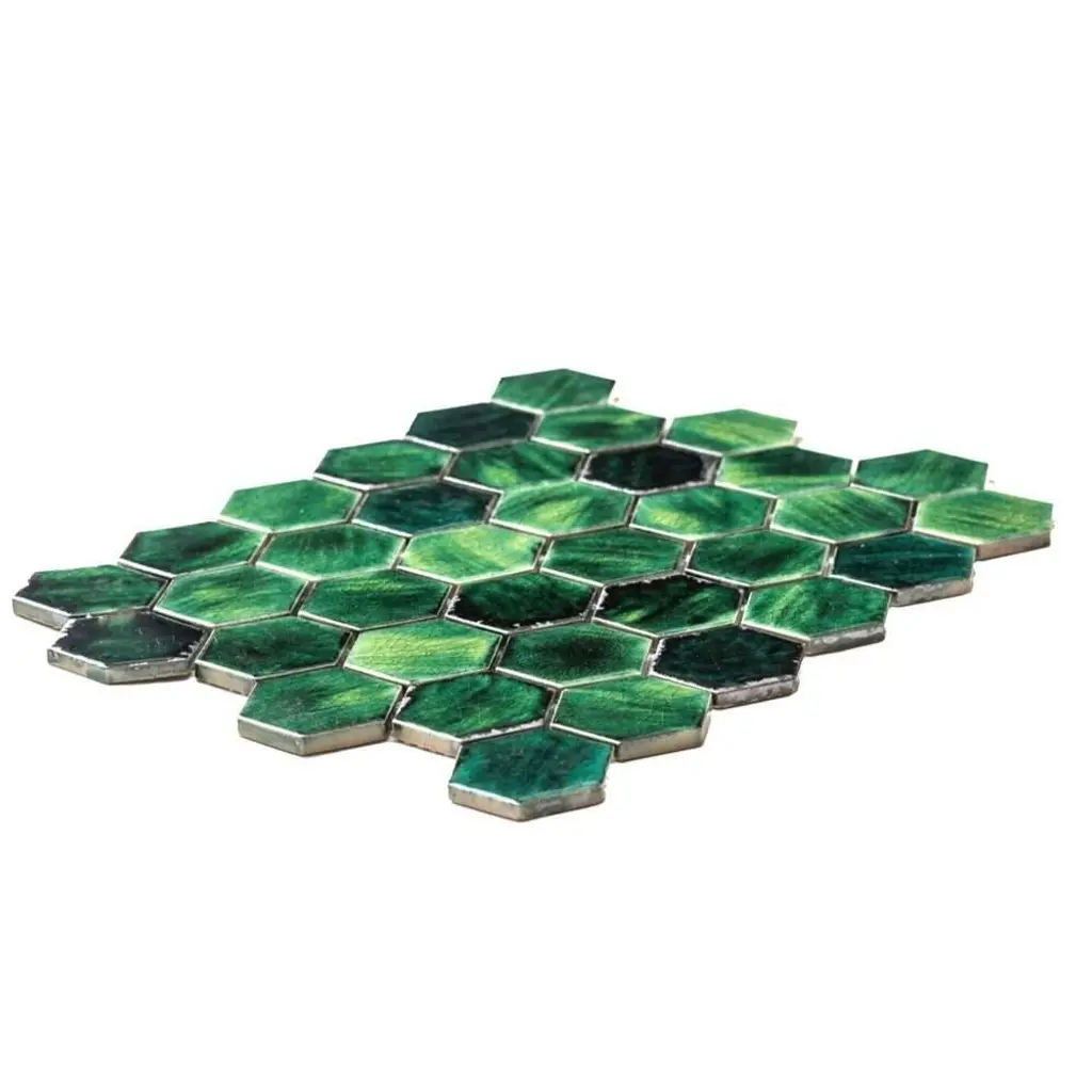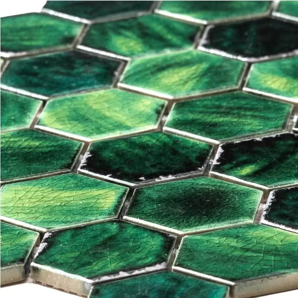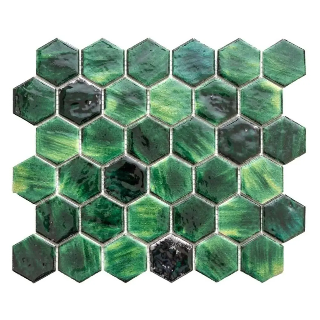 Experience a symphony of sophistication with our Agate Collection, boasting a reflective glossy finish that adds a touch of luxury to any space. Crafted with an artisanal touch, the Agate tiles offer a bold yet refined aesthetic. Each tile is a masterpiece with vibrant, crackled colorways arranged in a mesmerizing hexagon format accentuated with unique metal tones. With its distinctive metallic crackle and watercolored color variation, Agate distinguishes itself from the traditional hexagon mosaic, making it the perfect installation for any bathroom or kitchen space.