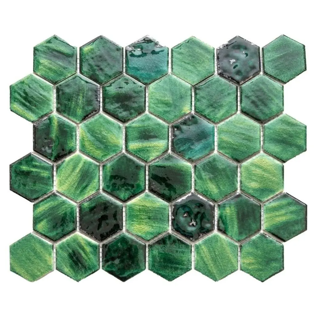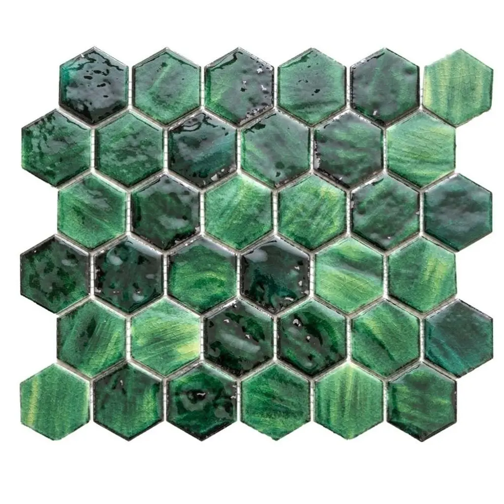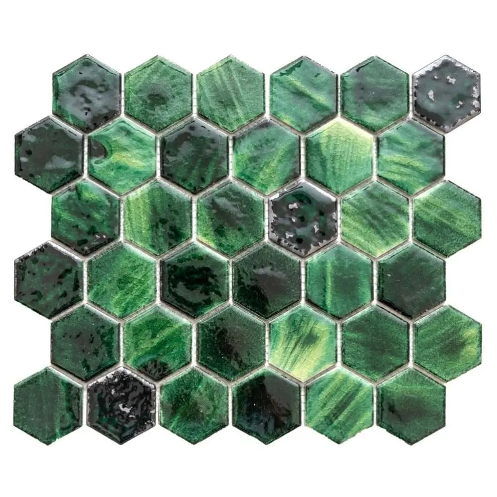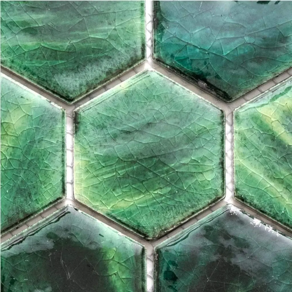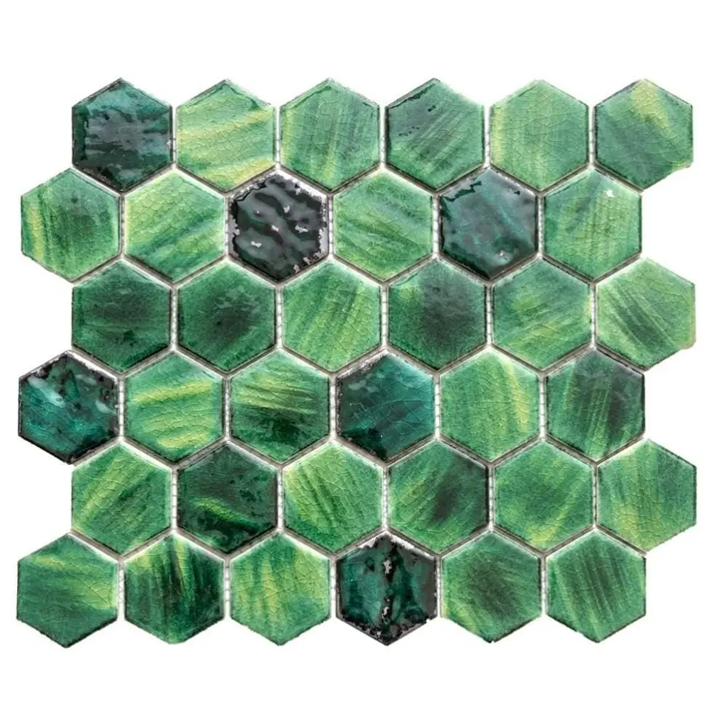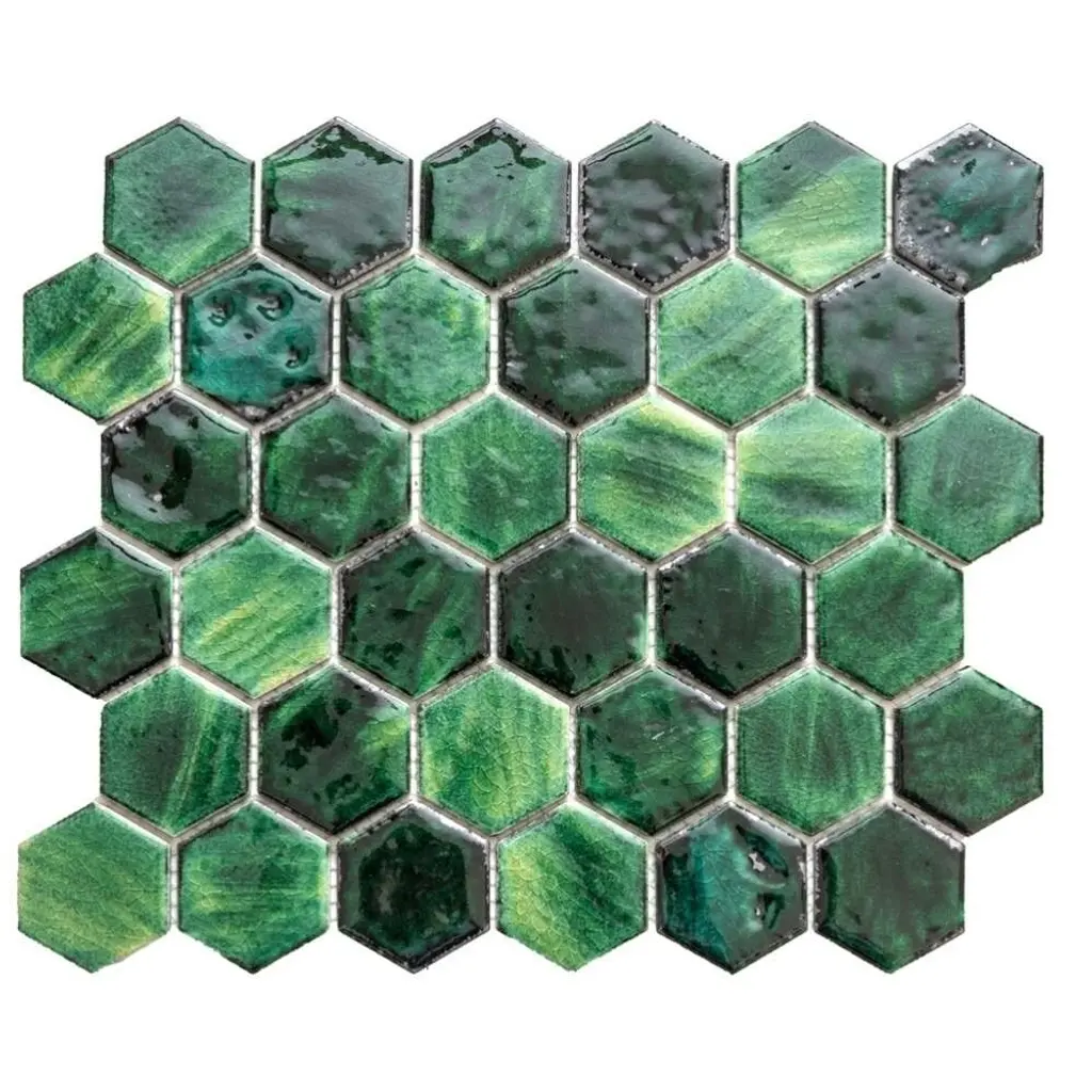 Experience a symphony of sophistication with our Agate Collection, boasting a reflective glossy finish that adds a touch of luxury to any space. Crafted with an artisanal touch, the Agate tiles offer a bold yet refined aesthetic. Each tile is a masterpiece with vibrant, crackled colorways arranged in a mesmerizing hexagon format accentuated with unique metal tones. With its distinctive metallic crackle and watercolored color variation, Agate distinguishes itself from the traditional hexagon mosaic, making it the perfect installation for any bathroom or kitchen space.