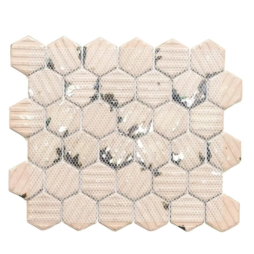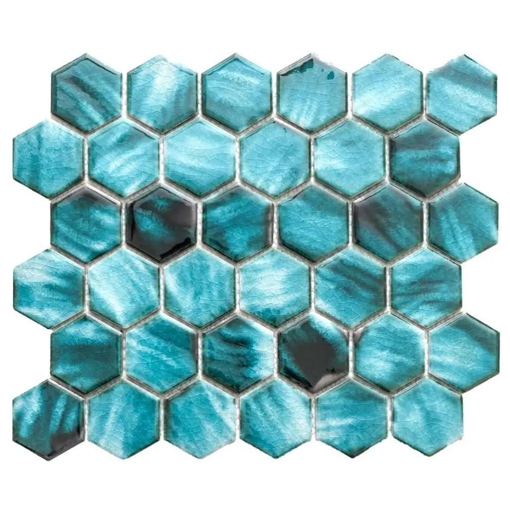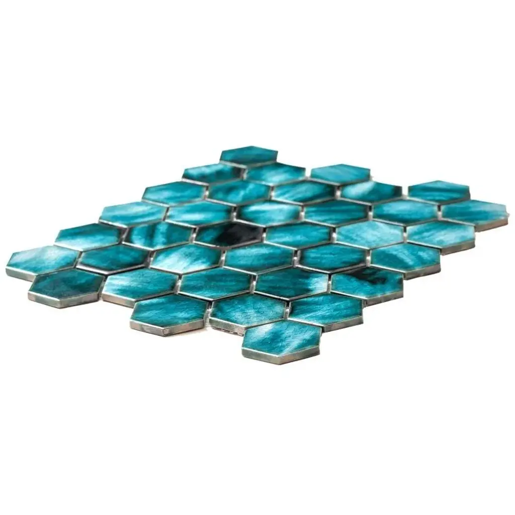 Experience a symphony of sophistication with our Agate Collection, boasting a reflective glossy finish that adds a touch of luxury to any space. Crafted with an artisanal touch, the Agate tiles offer a bold yet refined aesthetic. Each tile is a masterpiece with vibrant, crackled colorways arranged in a mesmerizing hexagon format accentuated with unique metal tones. With its distinctive metallic crackle and watercolored color variation, Agate distinguishes itself from the traditional hexagon mosaic, making it the perfect installation for any bathroom or kitchen space.