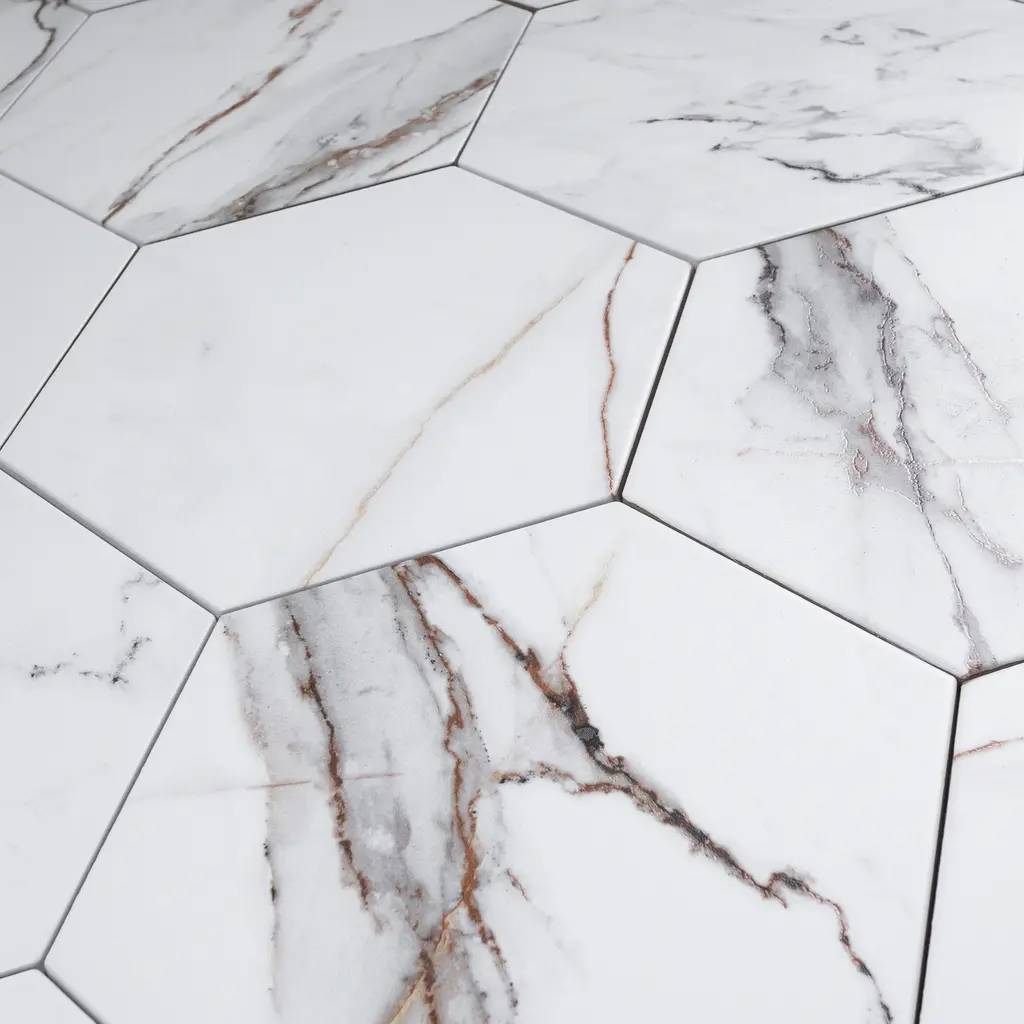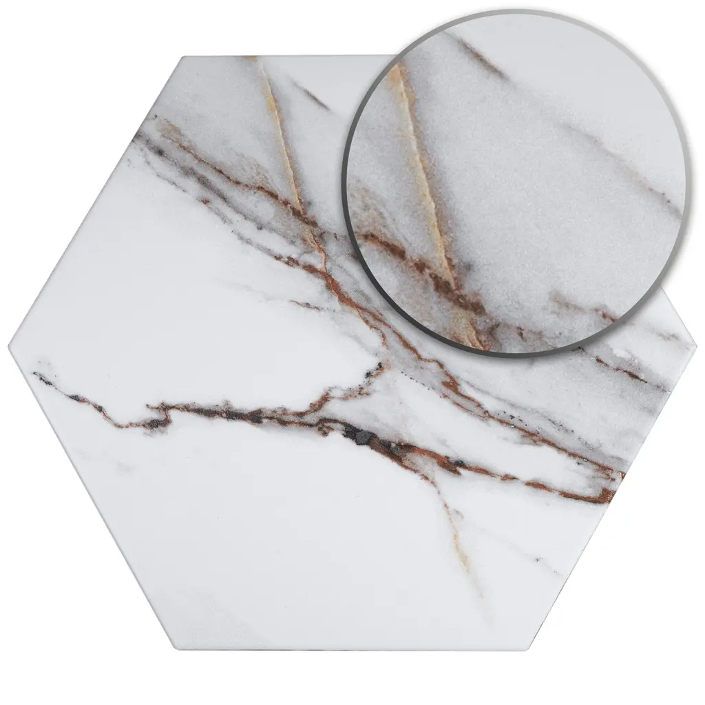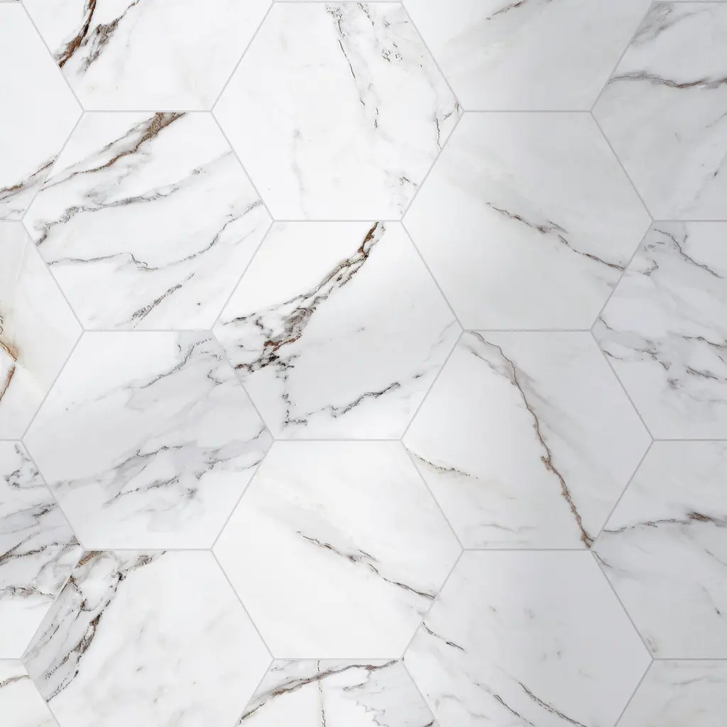 Tile Generation Calacatta Gold 8" x 9" Porcelain Marble Look Wall & Floor Tile features matte marble look design. High-quality Porcelain transforms your home into a magnificent space. The hexagon design creates beautiful layouts and designs when mixed and matched with other colors. It also features Low-maintenance and easy clean will make your life so much easier. This premium tile is an ideal and elegant look to your living room, kitchen and bathroom.Details