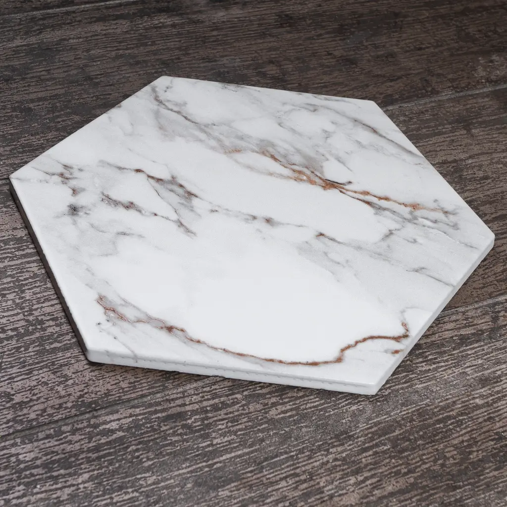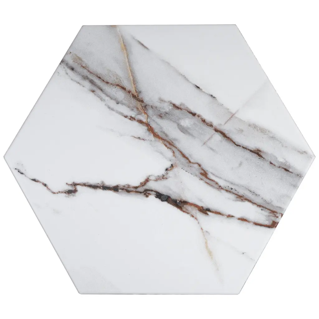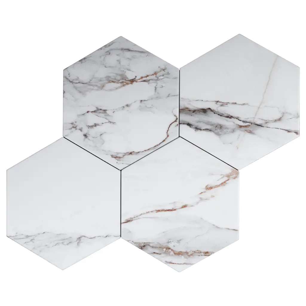 Tile Generation Calacatta Gold 8" x 9" Porcelain Marble Look Wall & Floor Tile features matte marble look design. High-quality Porcelain transforms your home into a magnificent space. The hexagon design creates beautiful layouts and designs when mixed and matched with other colors. It also features Low-maintenance and easy clean will make your life so much easier. This premium tile is an ideal and elegant look to your living room, kitchen and bathroom.Details
