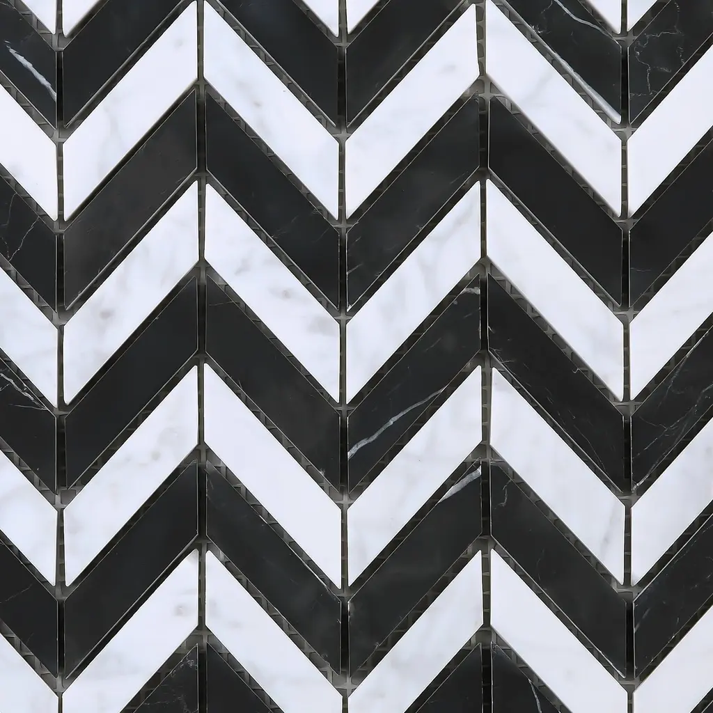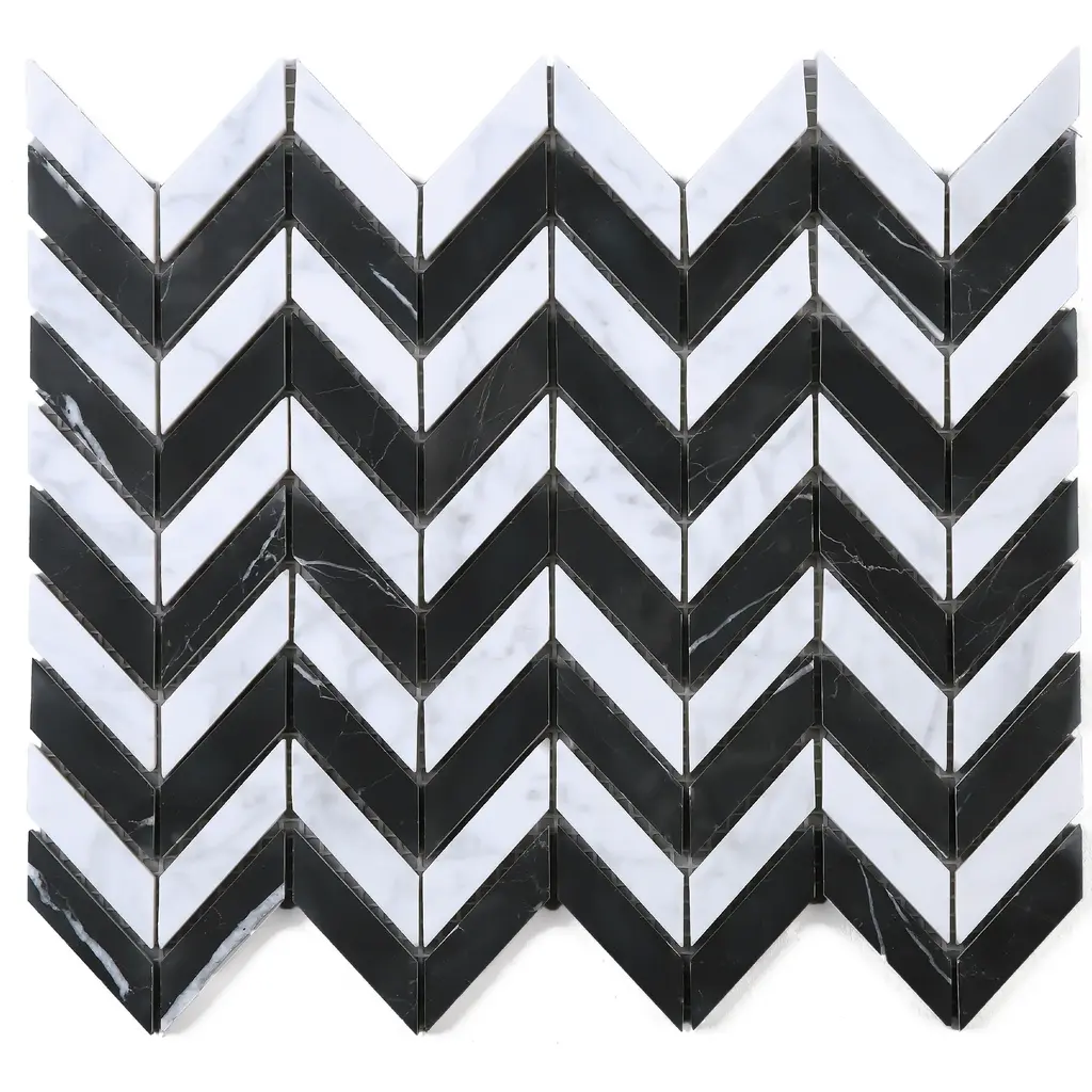 Tile Generation Marquina Wave 0.5" x 1.5" White Carrara Mosaic Tile in Black/White Floor and Wall Tile features semi-gloss stone look herringbone design. High-quality marble transforms your home into a magnificent space. The random herringbone creates beautiful layouts and designs when mixed and matched with other colors. It also features Low-maintenance and easy clean will make your life so much easier. This premium tile is an ideal and elegant look to your living room, kitchen and bathroom. Details The images have already display the most accurate color. However, color variation may still accurate due to the difference in computer monitor screen. All order will be shipped within 1-2 business days except large quantity order which is over 300 lbs will ship via freight carrier which might expect longer shipping time frame. Each item within an order will be selected from the same lot number which has no color or size variation, but multiple orders may cause receiving multiple lots of products. Please ensure that all tiles for a project is ordered within one order. If any reorder please email us by providing original order number to ensure receiving the same lot of product.