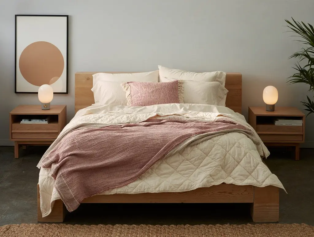 Matelassé woven from pure organic cotton, Topanga is whimsical, drapey and lightweight. It’s also conveniently reversible, with slim stripes on one side and ombre ripples of color on the other, so you can change the look of the bed with a quick flip.