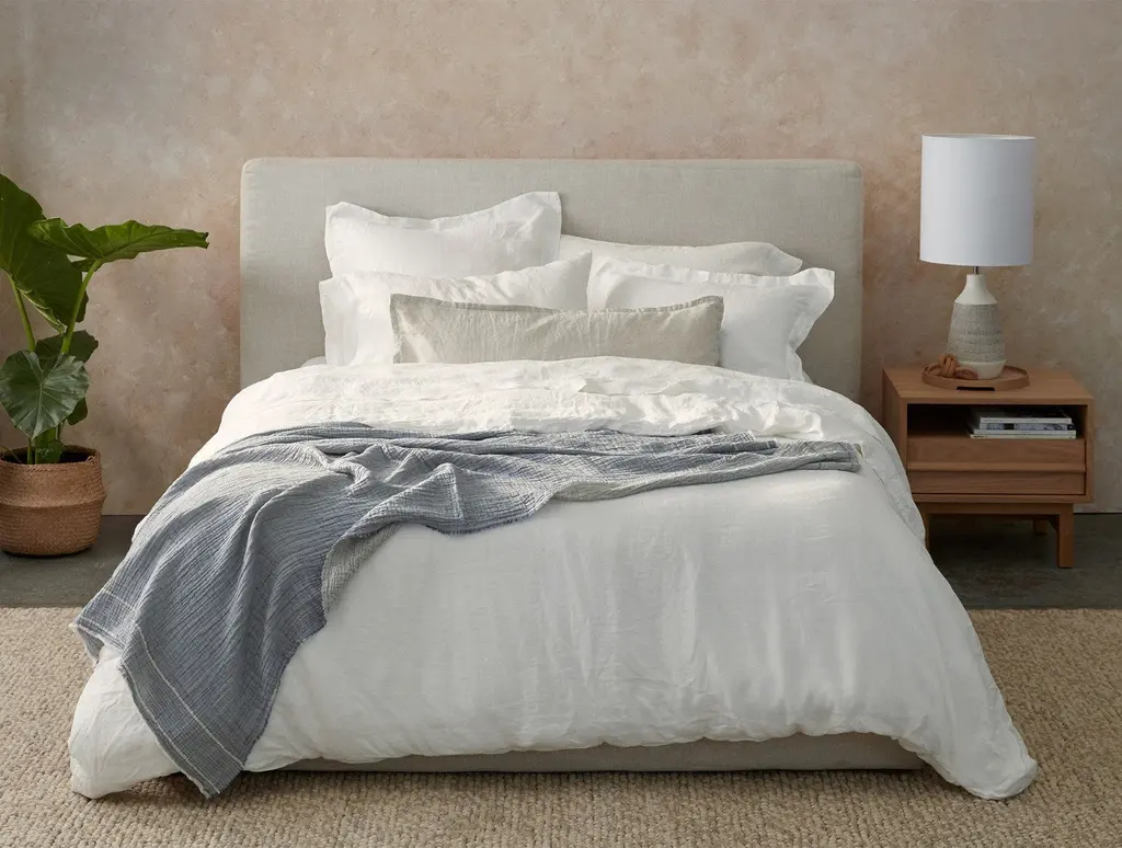 Matelassé woven from pure organic cotton, Topanga is whimsical, drapey and lightweight. It’s also conveniently reversible, with slim stripes on one side and ombre ripples of color on the other, so you can change the look of the bed with a quick flip.