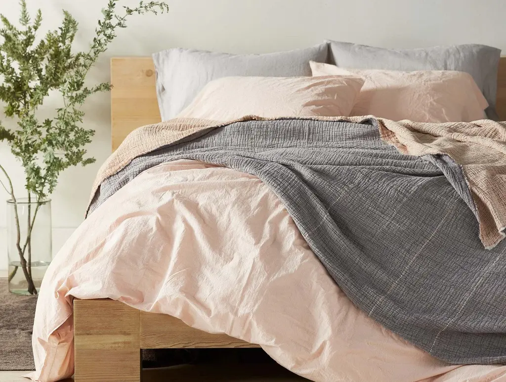 Matelassé woven from pure organic cotton, Topanga is whimsical, drapey and lightweight. It’s also conveniently reversible, with slim stripes on one side and ombre ripples of color on the other, so you can change the look of the bed with a quick flip.
