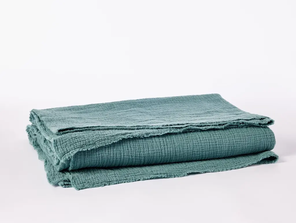 Matelassé woven from pure organic cotton, Topanga is whimsical, drapey and lightweight. It’s also conveniently reversible, with slim stripes on one side and ombre ripples of color on the other, so you can change the look of the bed with a quick flip.