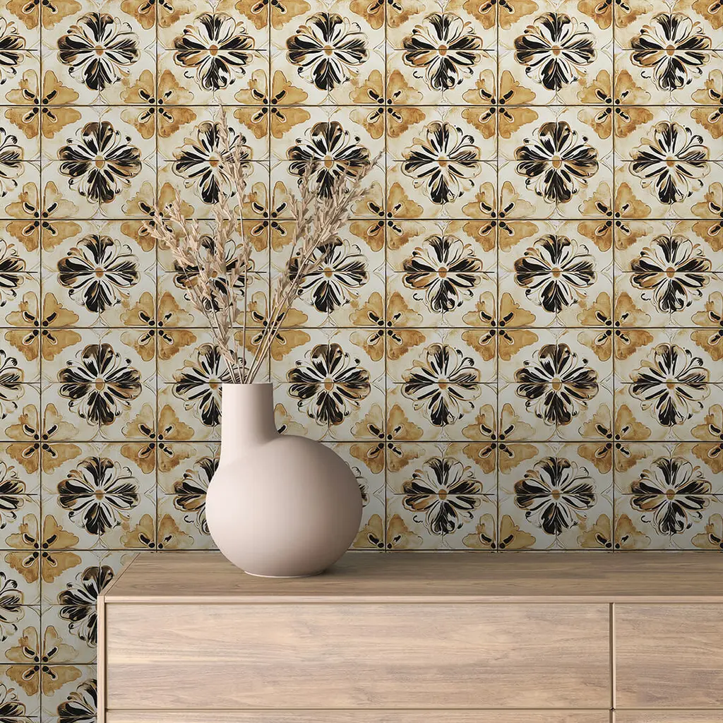 Tuscan Sepia Bloom Tile Capture the rustic charm of a Mediterranean villa with this intricate tile-patterned wallpaper. Its hand-painted floral motifs in a warm palette of sepia, black, and cream evoke a sense of timeless beauty, perfect for creating an inviting feature wall in a kitchen or living room. You can select from a Peel and Stick Smooth or Canvas Texture Vinyl option, or choose Light Textured Peel and Stick Fabric Wallpaper or Pre-Pasted Traditional Paper. We offer a personalized touch for each order. Please provide the dimensions (height and width) of the walls you wish to cover, and we’ll assist you in calculating the number of wallpaper sheets needed for your project. We understand that managing the details can be overwhelming, but we're here to help! Each panel measures 2 feet wide by 4 to 10 feet high, so multiple panels will be required to cover an entire wall. Wallpaper Samples: We always recommend requesting a sample to assess how our wallpaper adheres to your selected surface and how the design fits within your space. Each sample is available in two formats: A full-size sample to demonstrate the scale of the print. A mini version of a complete 24”x72” sheet to provide an overview of the design pattern. Standard Wallpaper Sheet Sizes: 24" wide x 48" high / 61 cm x 122 cm 24" wide x 72" high / 61 cm x 183 cm 24" wide x 96" high / 61 cm x 244 cm 24" wide x 108" high / 61 cm x 275 cm 24" wide x 120" high / 61 cm x 305 cm Sizes outside those listed are considered custom sizes. Wallpaper sheets can be tailored to be shorter or longer to fit your space perfectly. CUSTOM SIZES and COLORS are available upon request. Please contact us, and we’ll gladly assist you! Every order includes a detailed application manual and installation guide. Panel Overlap: Our wallpaper panels feature a 1-inch overlap, in addition to the 24-inch width. We strongly recommend not removing this overlap during the installation of peel and stick wallpaper. When determining the number of panels required, please do not count the overlap, as it will be covered by the adjacent panel.