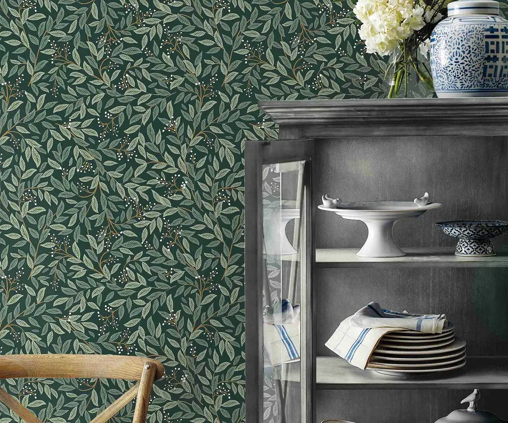 8 × 10" sample of our Willowberry peel & stick wallpaper. Lush and verdant, Willowberry features vines of greenery that are dotted with metallic berries. Please note that wallpaper samples are cut at random, and pattern placement of the sample you receive will not match the photo featured here.