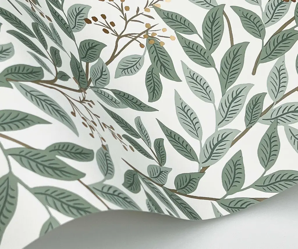 8" x 10" sample of our Willowberry wallpaper. Lush and verdant, Willowberry features vines of greenery that are dotted with metallic berries. This wallpaper is gravure printed and comes in 27 inch rolls with a 20.5 inch repeat.