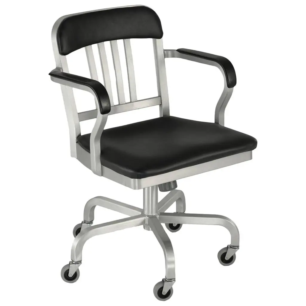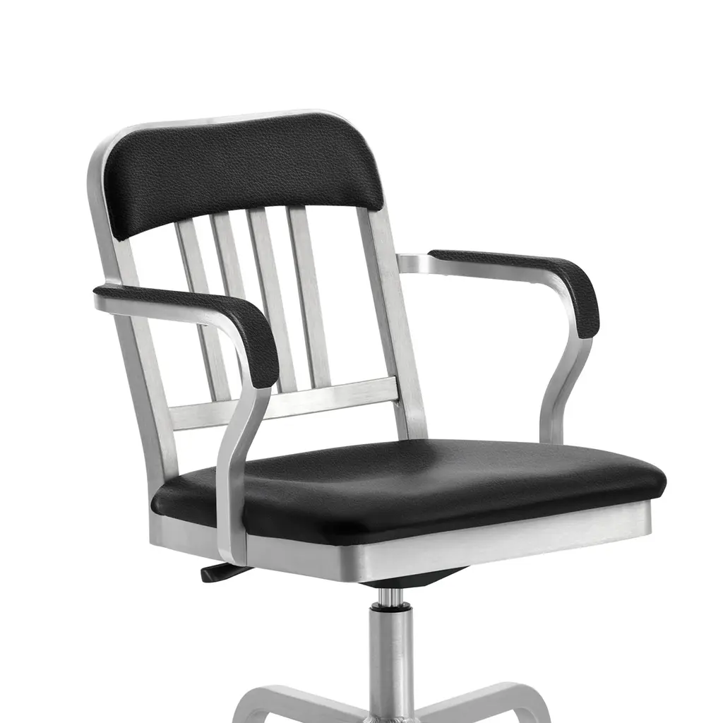 Navy Classic Semi-upholstered by Emeco, 1948 The classic semi-upholstered Navy Chair® was first introduced in 1948 when US Navy officers were redeployed off Navy Warships to land based facilities, and wanted a little more comfort than the ship board 1006 Navy Chair ® provided. Since then, the 1011 Navy swivel armchair has been used for settings where an extra level of comfort and durability is demanded. Height adjustable with a tilt mechanism to adjust the angle of the seat. Offered in black leather as standard - please contact us for custom textiles.